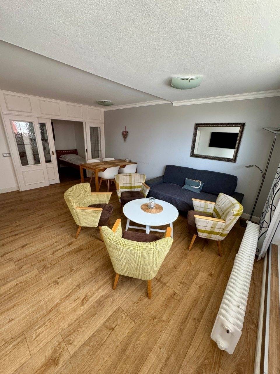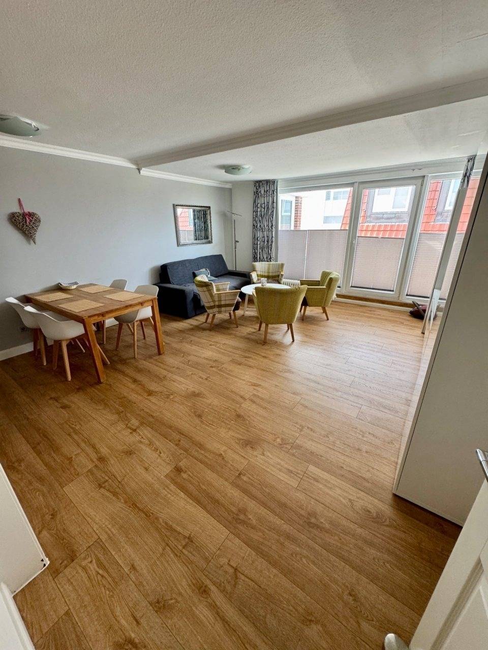 Der Wohnbereich ist mit einer Essecke, einer Couch mit Sessel, TV und WLAN. Vom Wohnbereich haben Sie Zugang zum Balkon, von dem Sie einen tollen Ausblick auf das Wattenmeer, das Vogelschutzgebiet und die Insel Neuwerk genießen.