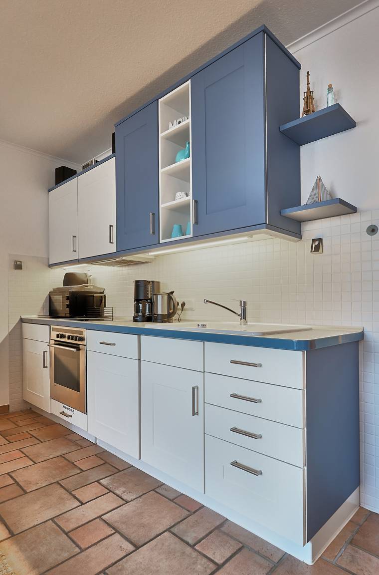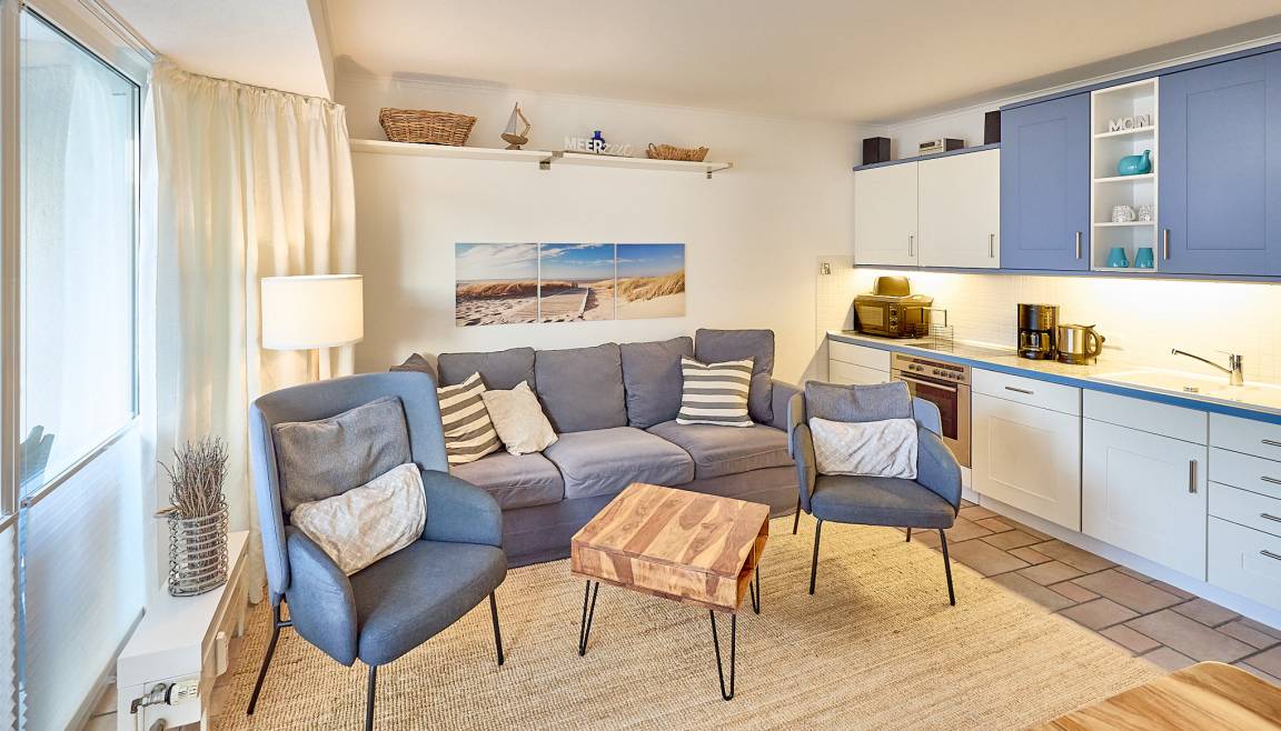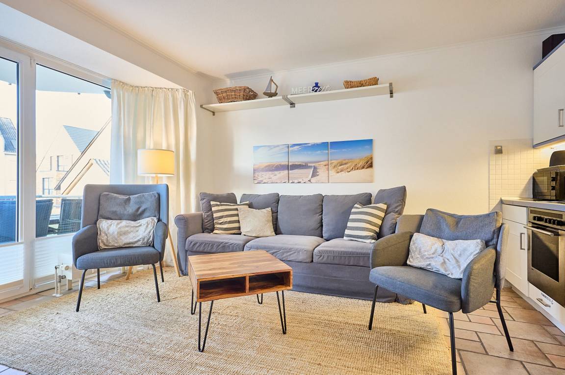 Die kompakte Küchenzeile ermöglicht eine unkomplizierte Selbstversorgung und bietet alles, was man für den Urlaubsalltag benötigt. Der Westbalkon lädt zu sonnigen Nachmittagen und entspannten Abendstunden ein.