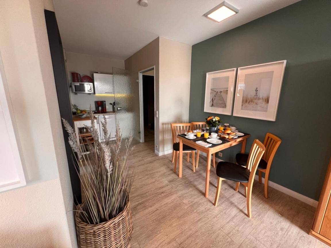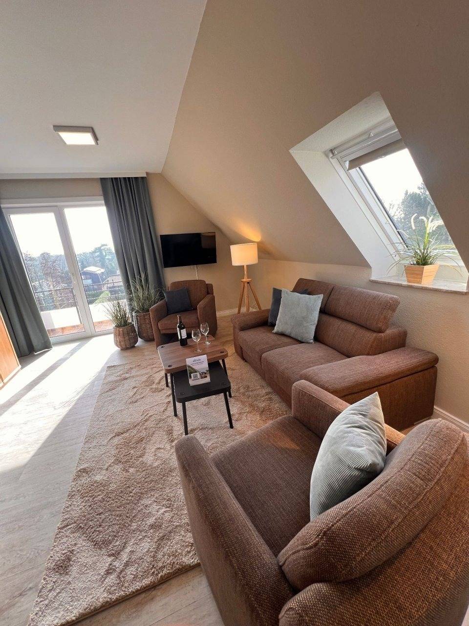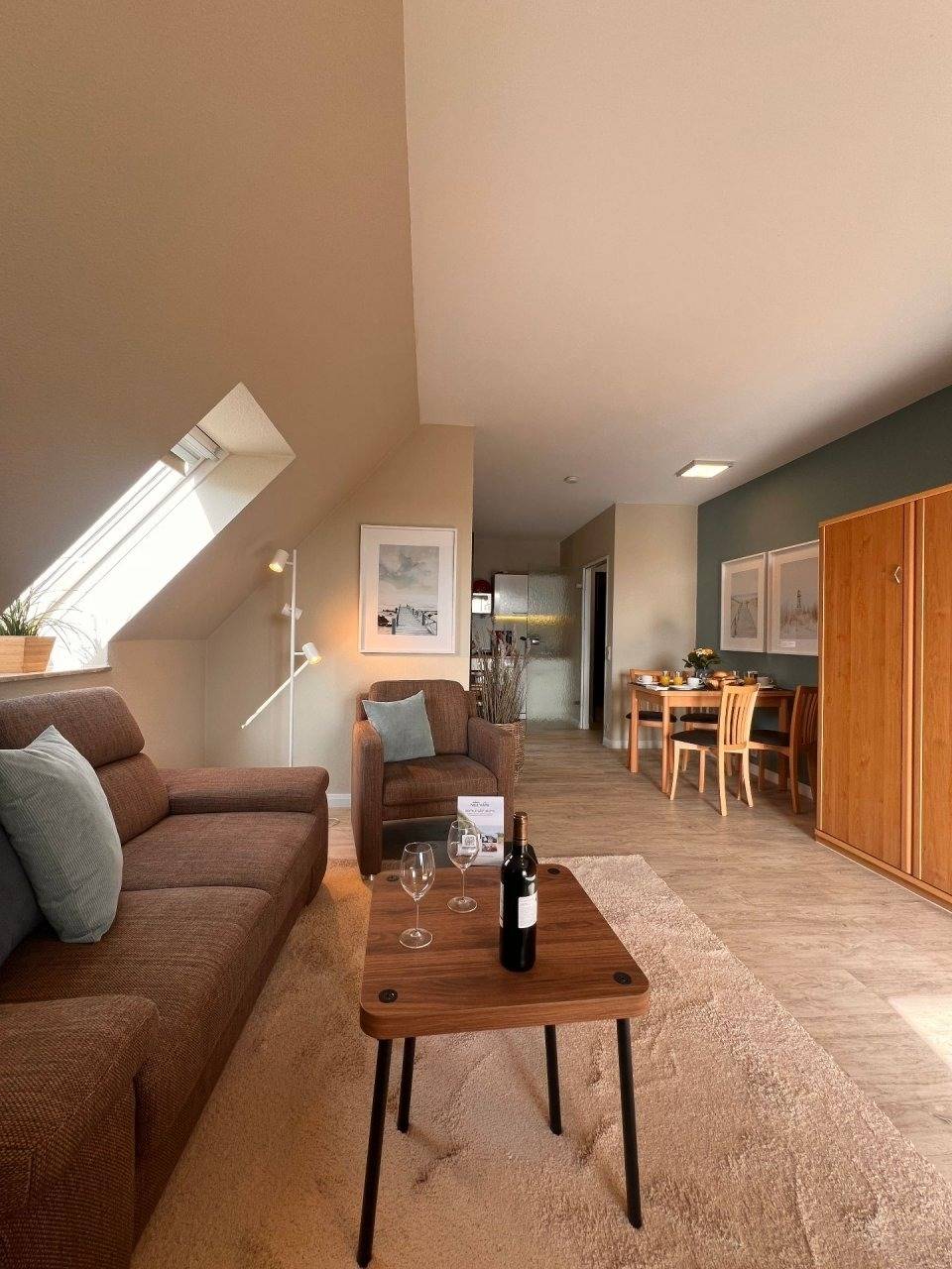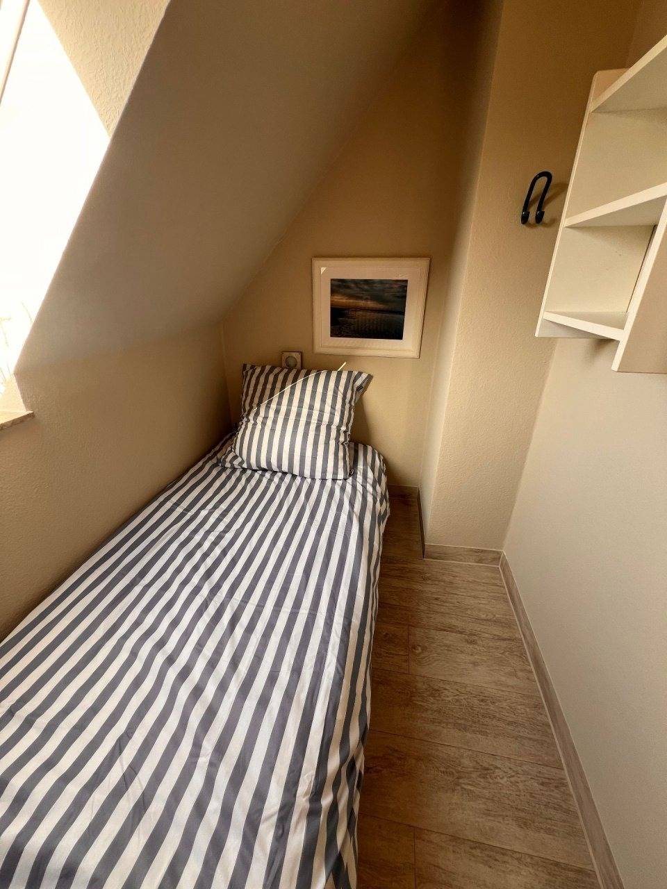 2-Zimmer Appartement im Haus "Nige Wark". In der TV-/Leseecke im Wohnzimmer befindet sich ein gemütliches Zweisitzer-Sofa, zwei Sessel und ein Flat- TV. Die integrierte Küchenzeile mit Spülmaschine, Mikrowelle und Kühlschrank mit Gefrierfach ist komplett ausgestattet und der ausziehbare Esstisch bietet genügend Platz für alle. Im Wohn-/Schlafraum befindet sich zusätzlich noch ein ein Schrankbett (2x90x200). Im Schlaf-/Kinderzimmer stehen zwei Einzelbetten (90x200). Das Badezimmer ist mit einer Dusche und WC ausgestattet. Die ca. 41 qm große Wohnung liegt im 2. OG und verfügt zudem auch über einen Balkon zum Garten