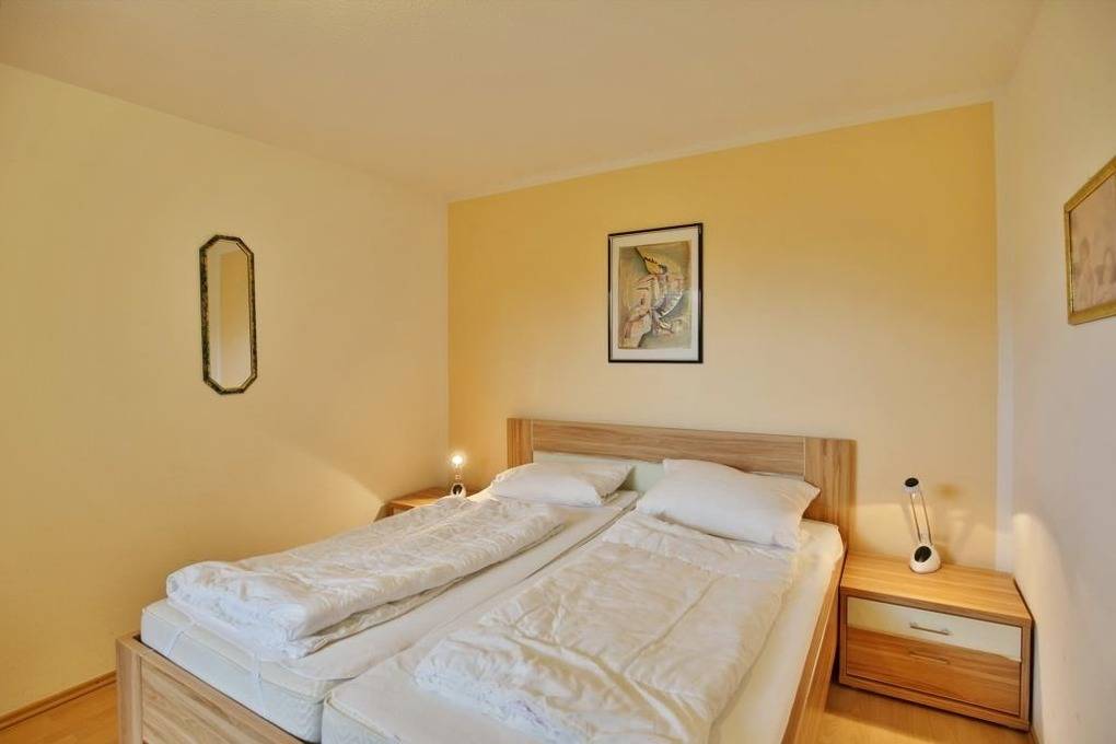 Hochwertige 3-Raum-Parterrewohnung mit ca. 52m². Komplett ausgestattet bis 3 Pers. Wohnzimmer mit Küchenzeile und Zugang zur Terrasse (west), Kabel-TV, W-Lan kostenfrei. 1 Schlafzimmer mit Doppelbett [&] TV, 1 innenliegendes Schlafzimmer mit Einzelbett, Du/WC, keine Haustiere, Nichtraucher, reservierter Pkw-Stellplatz #9 vor dem Haus.