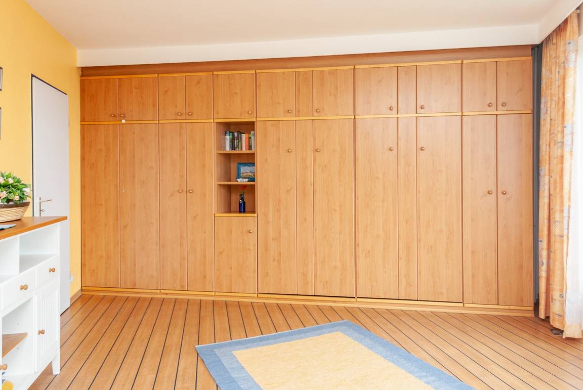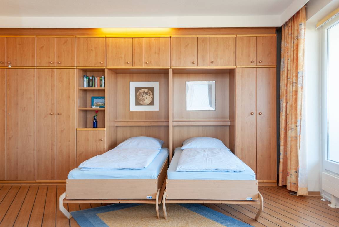 Das Apartment besteht aus einem Schlafzimmer mit 1 Schrankbett für 2 Personen , einem Wohnbereich mit zusätzlichem Schrankbett für 2 Personen und einem Badezimmer mit Dusche sowie WC. Die Ferienwohnung beinhaltet eine voll ausgestattete offene Küche.
