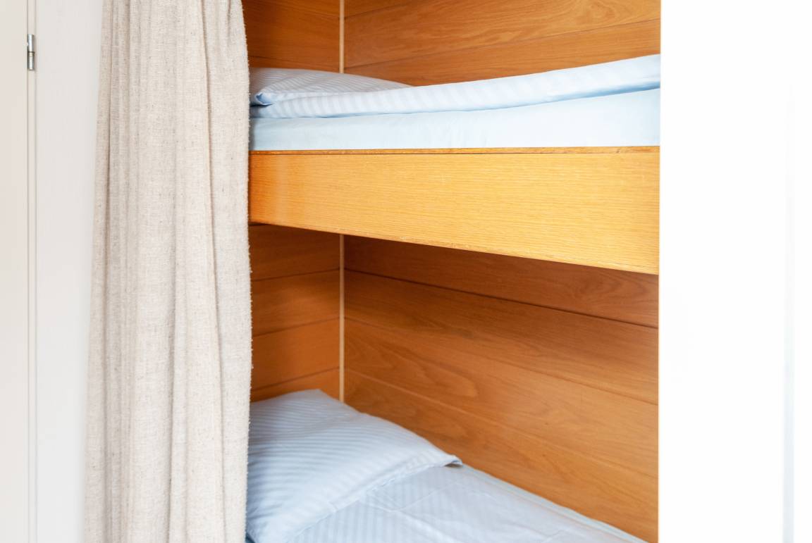 Das Apartment besteht aus einem Wohnbereich mit Schrankbett für 2 Personen, aus einem zusätzlichem Etagenbett in einer Nische im Flur und einem Badezimmer mit Dusche sowie WC. Die Ferienwohnung beinhaltet eine voll ausgestattete offene Küche.