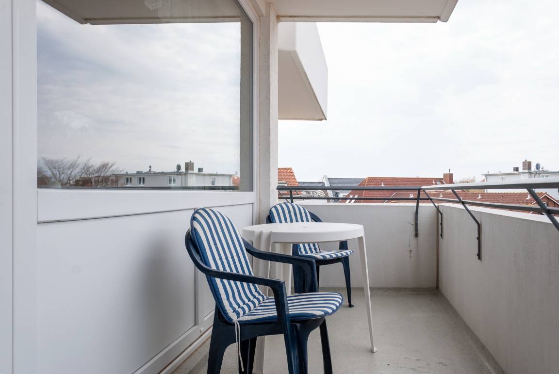 Das Apartment 302 ist ein 1-Raum-Apartment im 3. Obergeschoss für bis zu 4 Personen mit 40 qm. Der Westbalkon mit Meerblick bietet Ihnen vormittags Schatten und nachmittags Sonne.