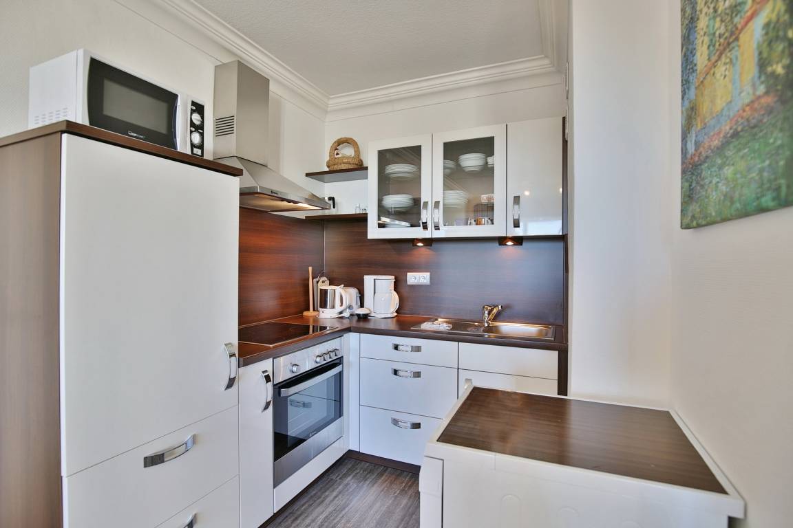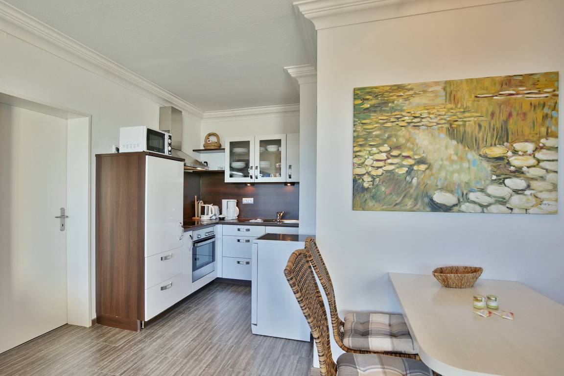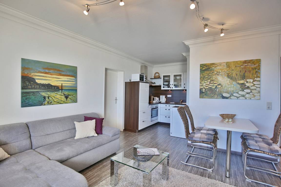 Die 2-Zimmer Ferienwohnung besticht durch ein gemütliches Ambiente. Das separate Schlafzimmer mit Doppelbett gewährleistet, dass Sie sich auch im Schlaf erholen. Das komfortable Ecksofa lädt zum Verweilen ein. Dank LCD-Fernseher sehen Sie auch im Urlaub Ihre Lieblingsserie und die Sportschau. Die Küche mit Backofen, Mikrowelle und Geschirrspüler, bietet Selbstversorgern allerlei Möglichkeiten.