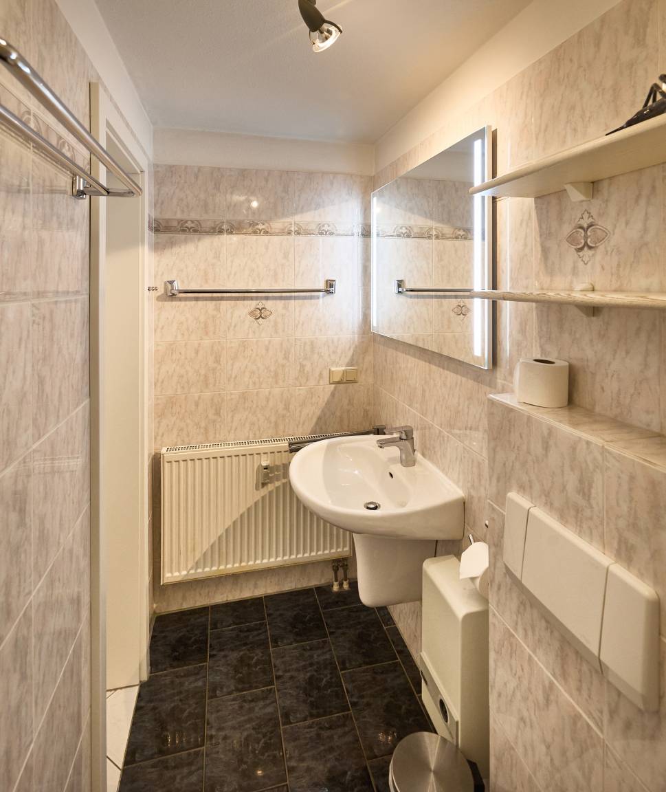 Das innenliegende Duschbad mit WC wurde Anfang 2026 komplett neu modernisiert (leider noch nicht in der Galerie bebildert!). Es bietet eine schöne Beleuchtung und Ablagen. So kann der Morgen starten.