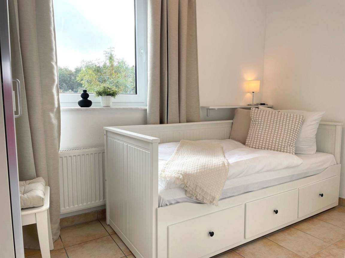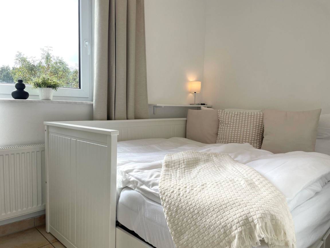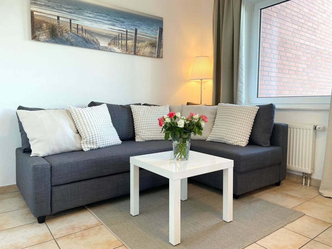 Die Ferienwohnung im 2. Obergeschoss bietet auf 51 qm Platz für bis zu 6 Personen und zeichnet sich durch eine durchdachte Raumaufteilung aus. Sie verfügt über ein Schlafzimmer mit Doppelbett, ein kleineres Schlafzimmer mit ausziehbarem Tagesbett sowie ein Schlafsofa im Wohnzimmer. Der geschmackvoll eingerichtete Wohnbereich ist mit einem Flatscreen-TV ausgestattet. Die Küchenzeile bietet essentielle Geräte wie Herd, Mikrowelle, Toaster, Wasserkocher und Kaffeemaschine. Ein Balkon mit Teil-Meerblick lädt zum Entspannen ein. Die Wohnung ist bequem über einen Aufzug erreichbar. Gemeinschaftliche Einrichtungen, wie der Fahrradkeller, befinden sich im Erdgeschoss und bieten praktischen Stauraum für Fahrräder.