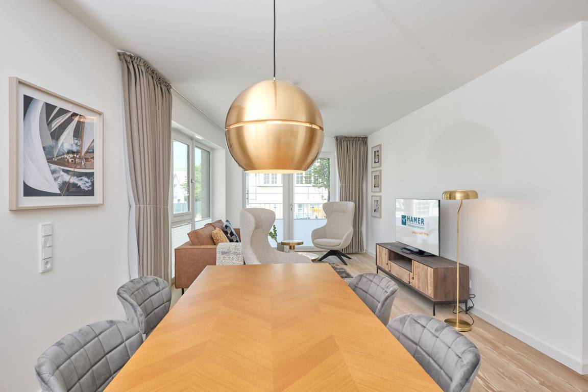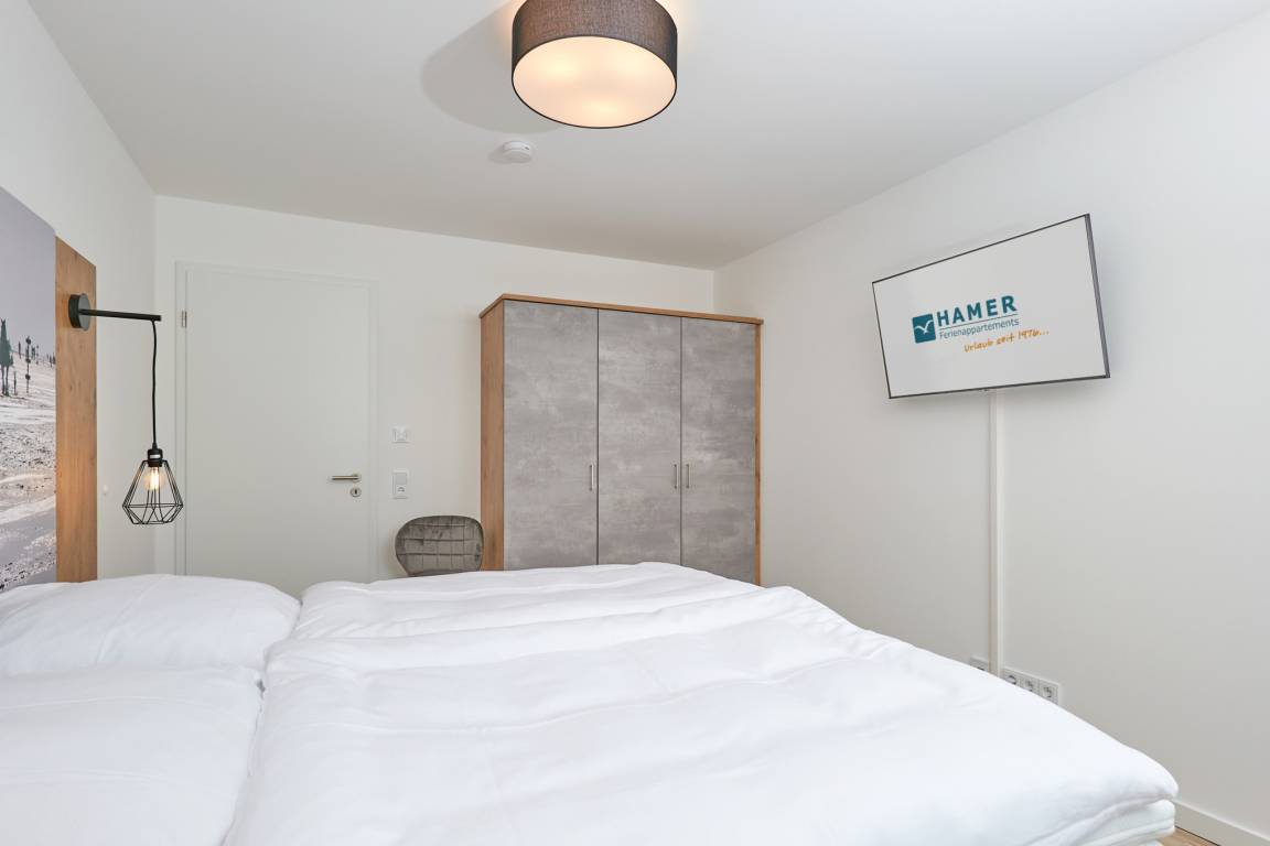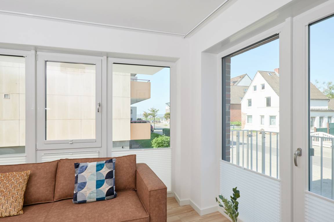 Neubau Mai 2023! Sehr schöne, moderne 3-Raum-Wohnung bis 4 Pers. voll ausgestattet auf ca. 87 m² in der 1.Etage gelegen, 2 Schlafzimmer mit komfortablen Doppelbetten (Bettwäsche inkl.) und Außenjalousien an allen Fenstern, Hinweis: Ein Schlafzimmer mit Empore für das Doppelbett - eingeschränkte Kopffreiheit, ebenerdige Dusche/WC, Wohnzimmer mit großer Küchenzeile (Backofen, Geschirrspüler, Mikrowelle) 2x Kabel-TV, Radio, kostenfreies W-LAN-Internet, kleiner Balkon (nord/ost) mit Teilseesicht, Personenaufzug, reservierter Pkw-Stellplatz in der Tiefgarage inkl., es sind keine Haustiere erlaubt und natürlich Nichtraucher. Durchfahrtshöhe Tiefgarage: 2,05m.