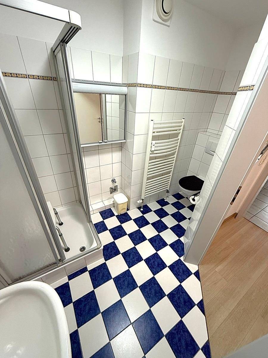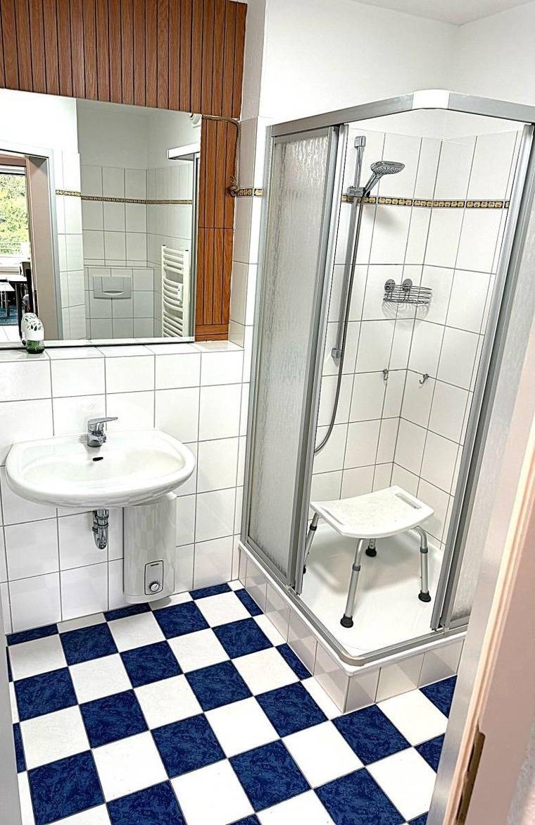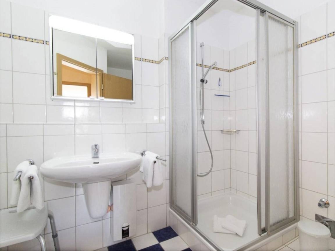 Das moderne Badezimmer ist mit Dusche, WC und Föhn ausgestattet. Dank barrierefreiem Zugang und Aufzug eignet sich die Wohnung auch hervorragend für ältere Gäste.