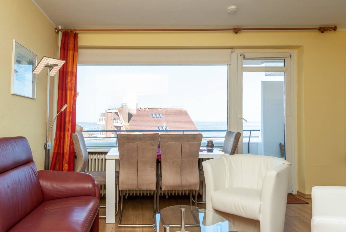 Das Apartment 501 ist ein 2-Raum-Apartment im 5. Obergeschoss für bis zu 2 Erwachsene Personen und 2 Kinder mit 50 qm. Der Westbalkon mit Meerblick bietet Ihnen vormittags Schatten und nachmittags Sonne.