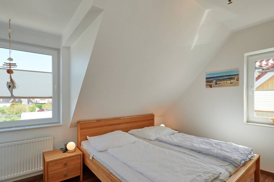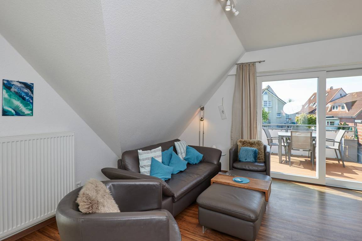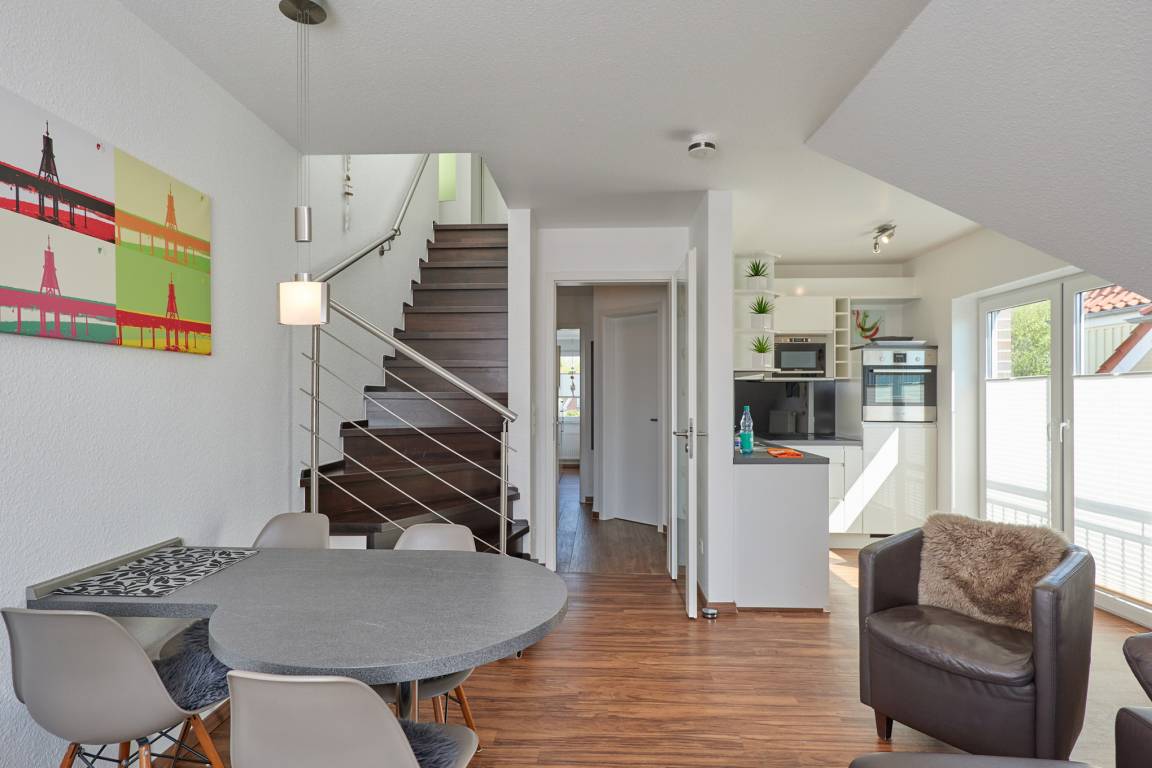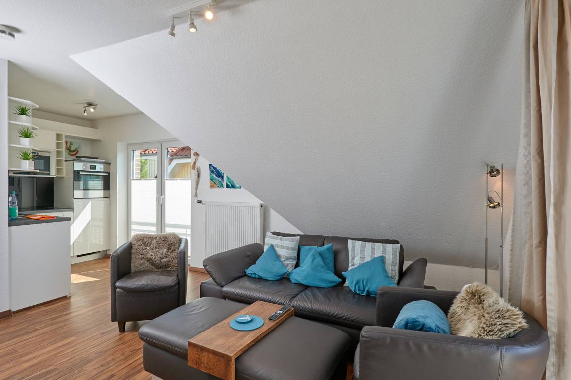 Sehr schöne, helle 3-Raum-Maisonette-Wohnung (57m²) bis 4 Pers., 1.Etage, 1 Schlafzimmer mit Doppelb., 1 Schlafzimmer im Dachgeschoss mit Einzelbetten, 2xDu/Wc, Wohnzimmer mit vollständiger Küchenzeile (Back., Mikrow., Senseo, Geschirrspüler) 3xSAT-TV,DVD-Player, Stereo, W-LAN kostenlos, großer Balkon (süd), Rollläden [&] teilweise Insektenschutzgitter, Pkw-Stellplatz #5, keine Haustiere erlaubt, Nichtraucher.