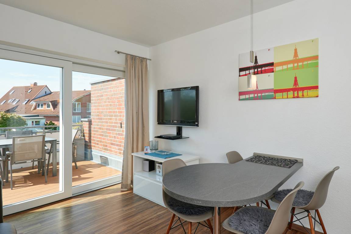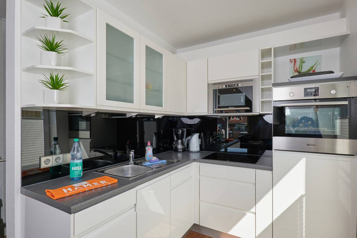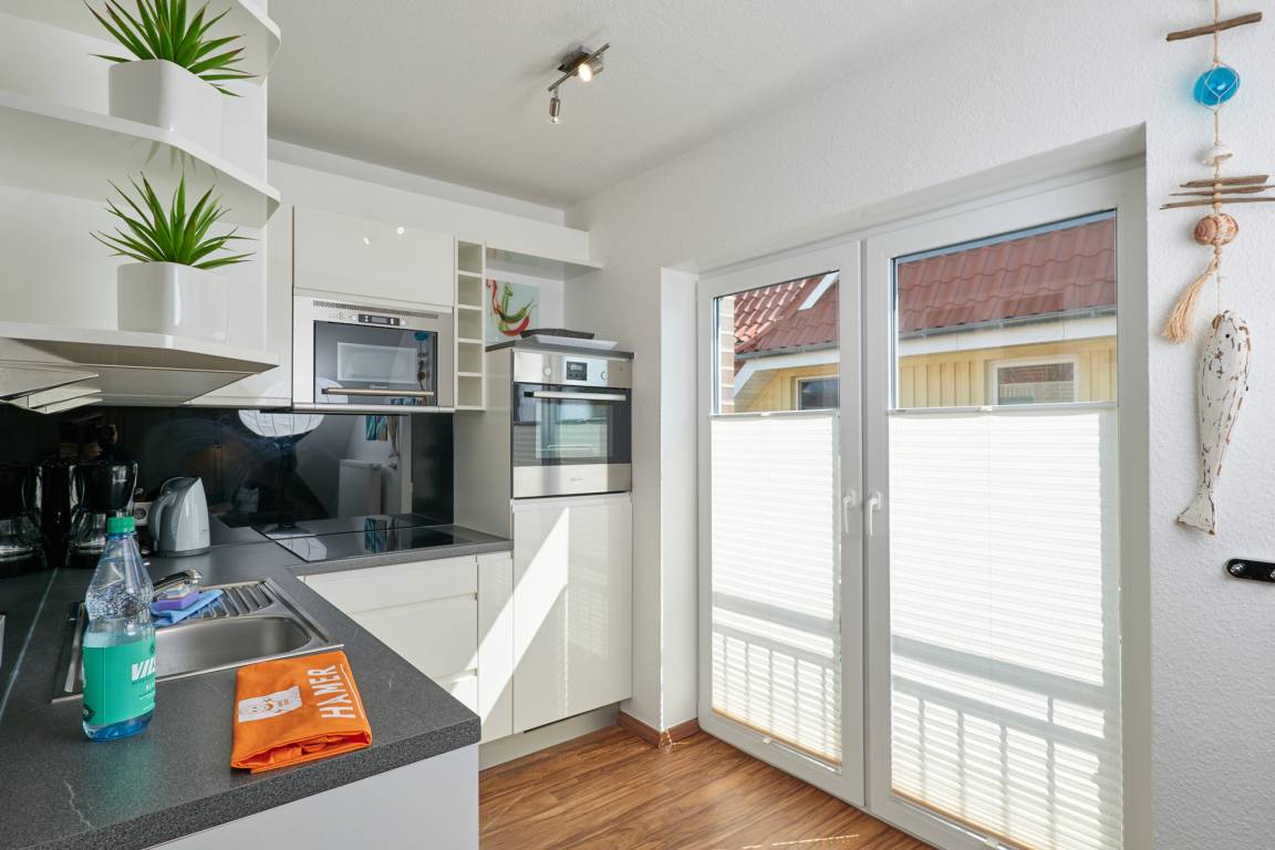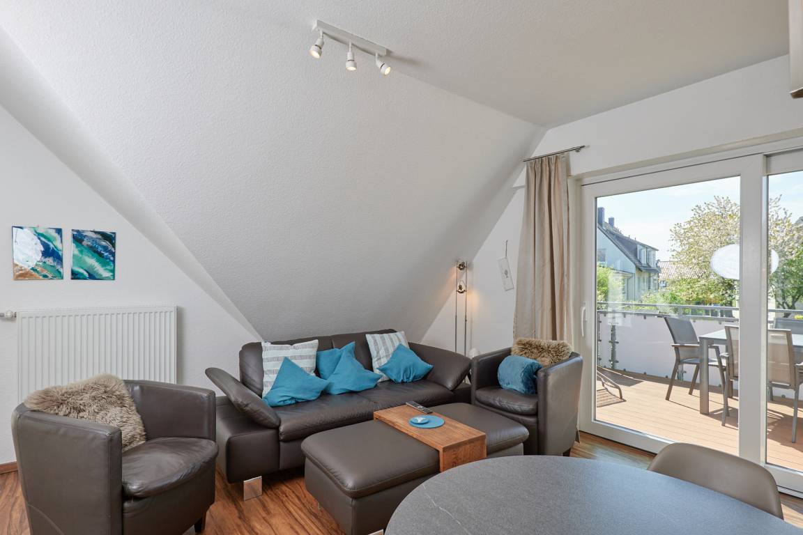 Sehr schöne, helle 3-Raum-Maisonette-Wohnung (57m²) bis 4 Pers., 1.Etage, 1 Schlafzimmer mit Doppelb., 1 Schlafzimmer im Dachgeschoss mit Einzelbetten, 2xDu/Wc, Wohnzimmer mit vollständiger Küchenzeile (Back., Mikrow., Senseo, Geschirrspüler) 3xSAT-TV,DVD-Player, Stereo, W-LAN kostenlos, großer Balkon (süd), Rollläden [&] teilweise Insektenschutzgitter, Pkw-Stellplatz #5, keine Haustiere erlaubt, Nichtraucher.