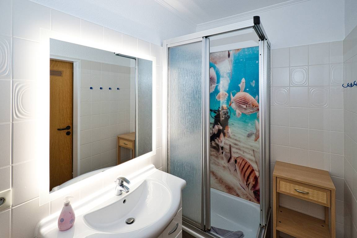 Zwei Schlafbereiche mit komfortablen Doppelbetten bieten erholsame Nächte. Das Badezimmer/WC ist mit Dusche und Fön ausgestattet.
