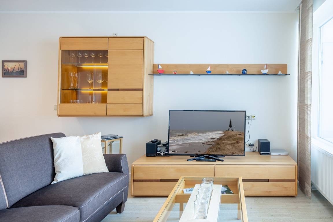 Ferienwohnung 304 im Haus Nautic liegt nur einen Steinwurf vom Deich entfernt. Nach einem erlebnisreichen Tag finden Sie in der großzügigen Ferienwohnung allen erdenklichen Komfort, um den Abend entspannt ausklingen zu lassen. Lehnen Sie sich auf der bequemen Couch zurück und genießen Sie den Ausblick auf den Weltschifffahrtsweg. Dank LCD-TV brauchen Sie auch im Urlaub nicht auf Ihre Lieblingsserie zu verzichten. Und an trüben Tagen lädt der runderneuerte Wellnessbereich mit Schwimmbad, Sauna, Regenduschen und beheizten Mosaikbänken zum Verweilen ein.