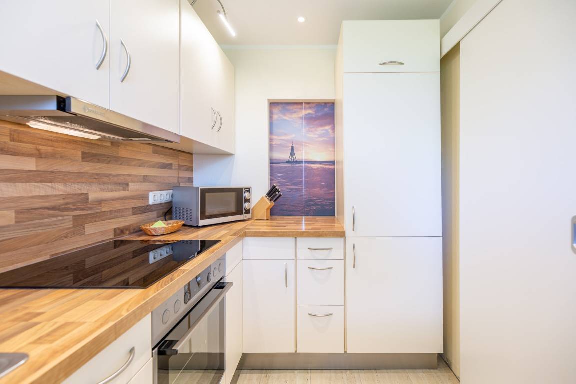 Mit 2 separaten Schlafzimmern, einer separaten Küche, einem modernen Bad, einem Wohn-/Esszimmer mit Meerblick und einem Balkon bietet die großzügige Ferienwohnung auf 70 m² genügend Platz für 2 bis 4 Personen. In der voll ausgestatteten Küche mit Durchreiche, Backofen und Geschirrspüler finden Sie jeglichen Komfort, den Sie in Ihrem Urlaub erwarten.