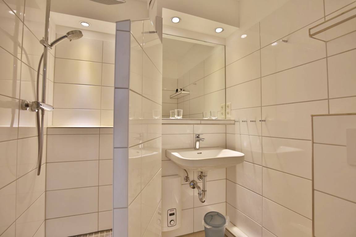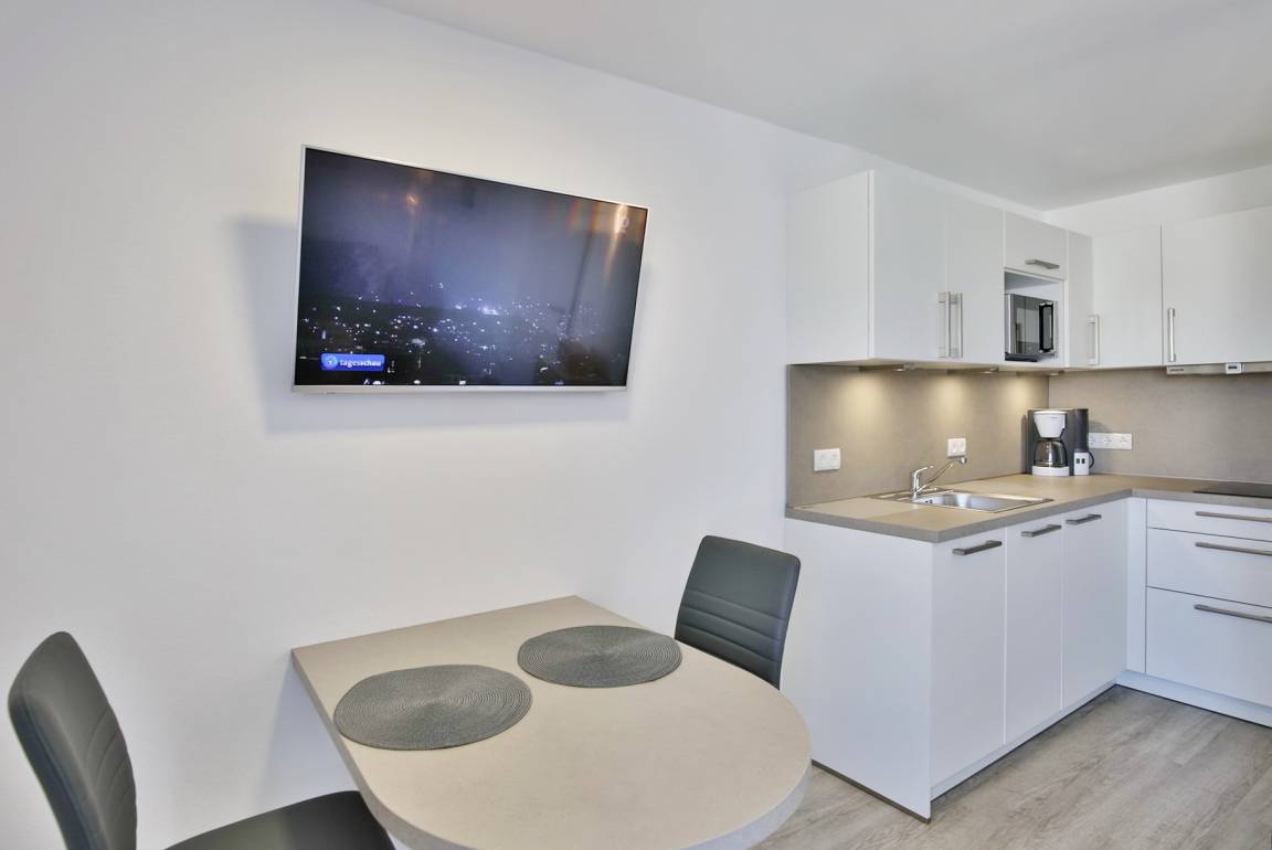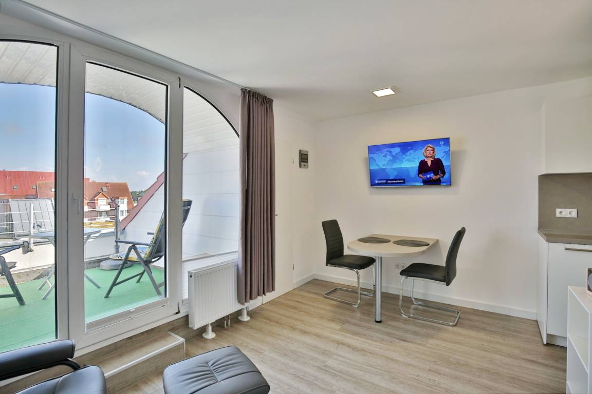 Komplett renoviertes 1-Raum-Appartement auf ca. 28m², 4. Etage, Nichtraucher, komplett ausgestattet bis 2 Pers., 1 kombiniertes Wohn/Schlafzimmer mit Doppelbettcouch mit neuer Matratze (Stand März '26), SAT-TV, kostenloses W-Lan, Küchenzeile mit Geschirrspüler, Ceranfeld [&] Mikrowelle, Mini-Backofen, Dusche/WC, Flur, Dachterrasse (ost) mit Seesicht, PKW-Stellplatz #409, keine Haustiere