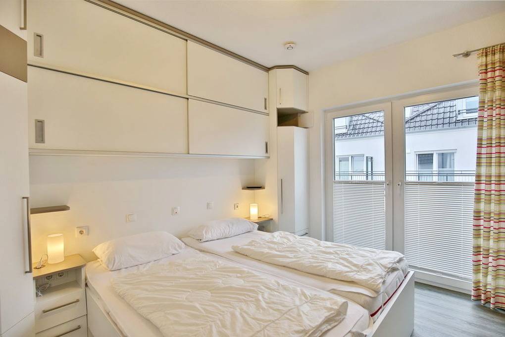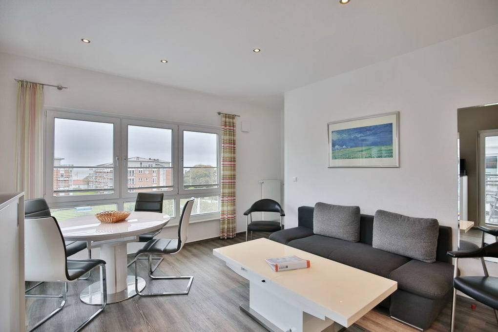 Sehr schöne, moderne 3-Raum-Wohnung bis 4 Pers. mit Seesicht. (ca. 65m²), 3.Etage, 1 Schlafzimmer mit Doppelbett und Außenjalousien, 1 Schlafzimmer mit zwei Einzelbetten, Wohnzimmer mit vollausgestatteter Küchenzeile (Back., Mikrow., Geschirrspüler), Schlafsofa, 2xSAT-TV, CD-Radio, kostenfreies W-Lan, 2xDu/WC, Haarföhn, Balkon (nord/west), Klimagerät im Wohnzimmer, Personenaufzug, reservierter Pkw-Stellplatz i.d. Tiefgarage, keine Haustiere erlaubt, Nichtraucher.