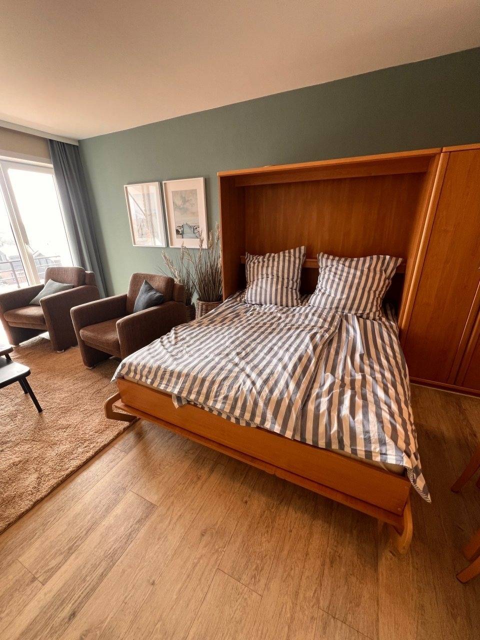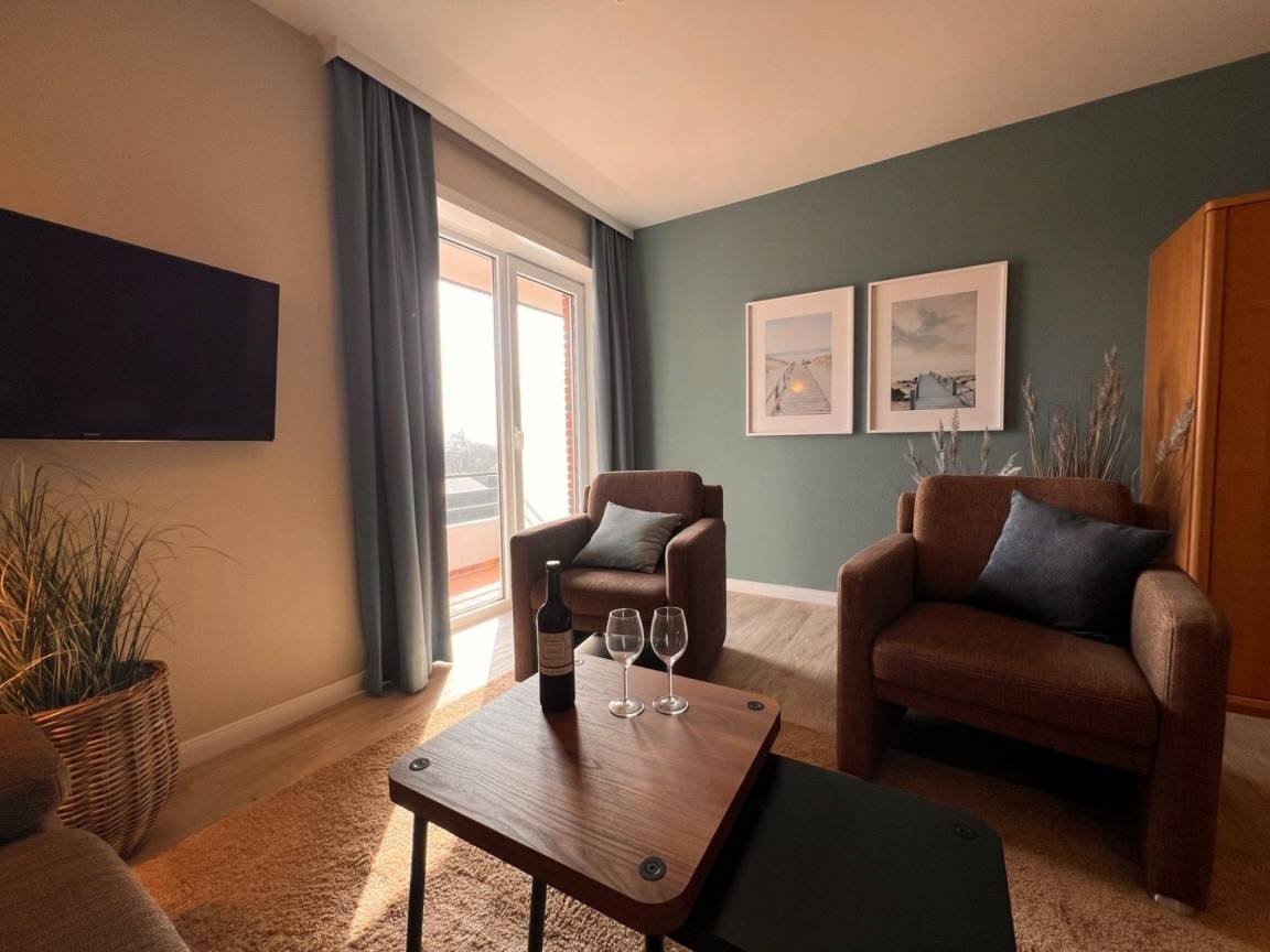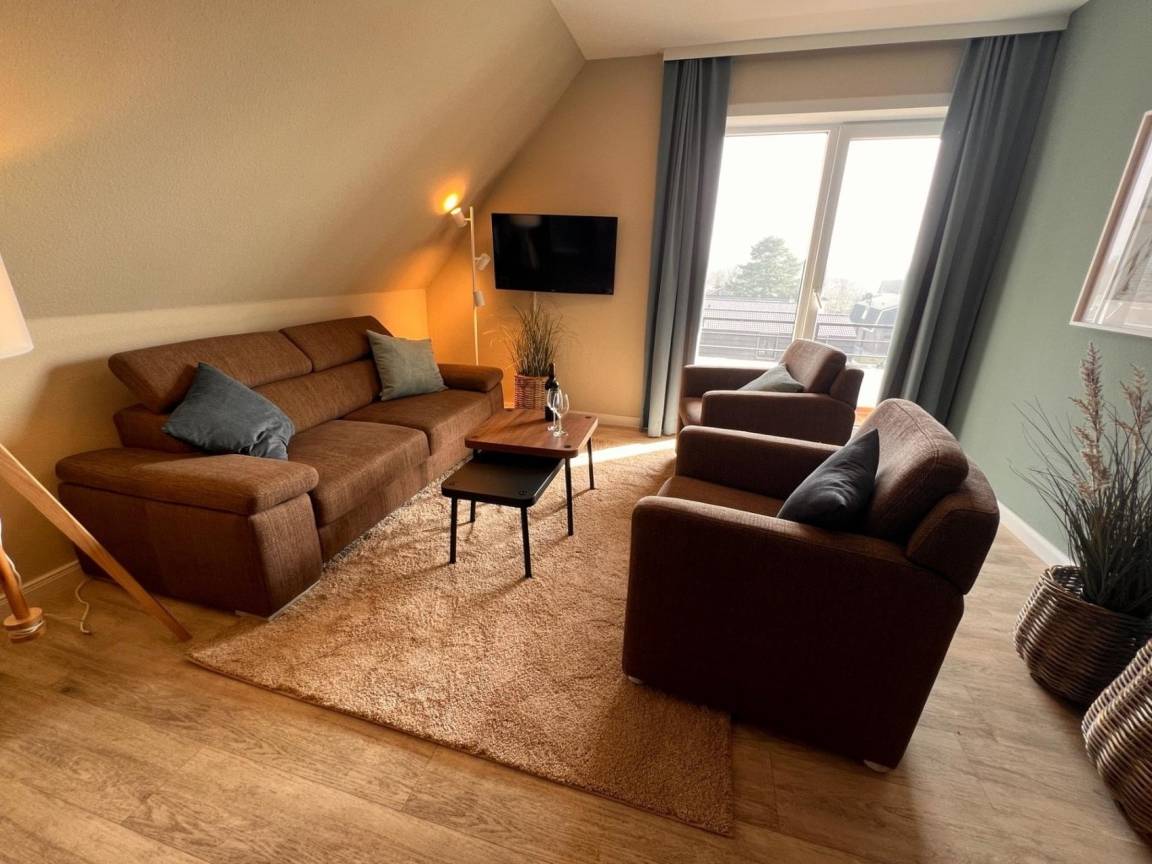 2-Zimmer Appartement im Haus "Nige Wark". In der TV-/Leseecke im Wohnzimmer befindet sich ein gemütliches Zweisitzer-Sofa, zwei Sessel und ein Flat- TV. Die integrierte Küchenzeile mit Spülmaschine, Mikrowelle und Kühlschrank mit Gefrierfach ist komplett ausgestattet und der ausziehbare Esstisch bietet genügend Platz für alle. Im Wohn-/Schlafraum befindet sich zusätzlich noch ein ein Schrankbett (2x90x200). Im Schlaf-/Kinderzimmer steht ein Etagenbett. Das Badezimmer ist mit einer Dusche und WC ausgestattet. Die ca. 40 qm große Wohnung liegt im 2. OG und verfügt zudem auch über einen Balkon zum Garten