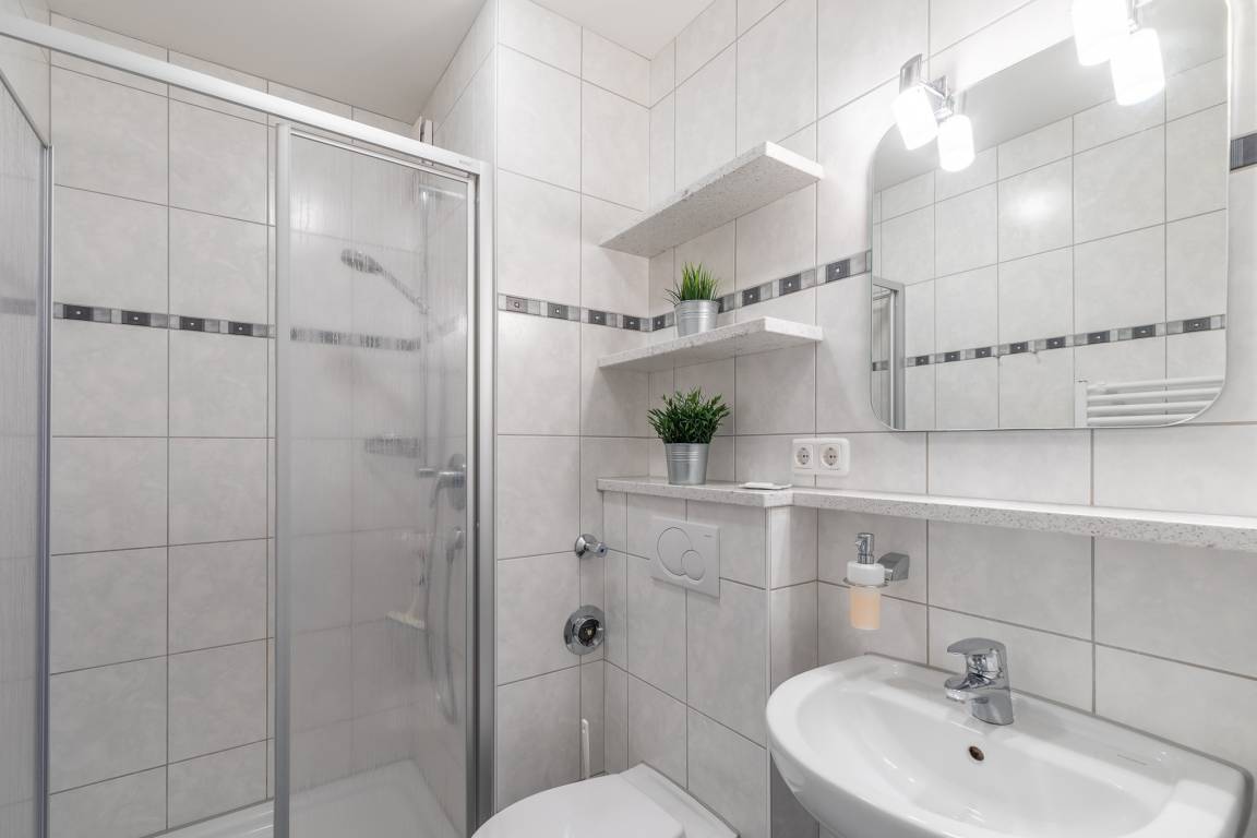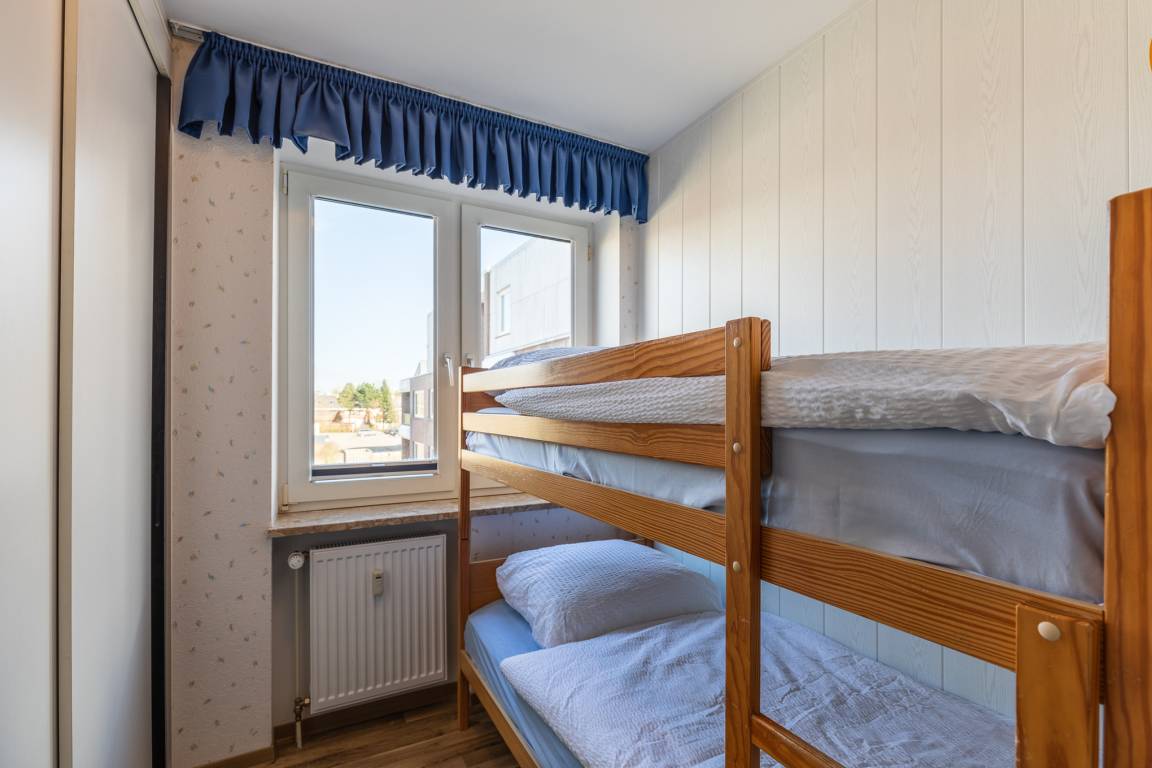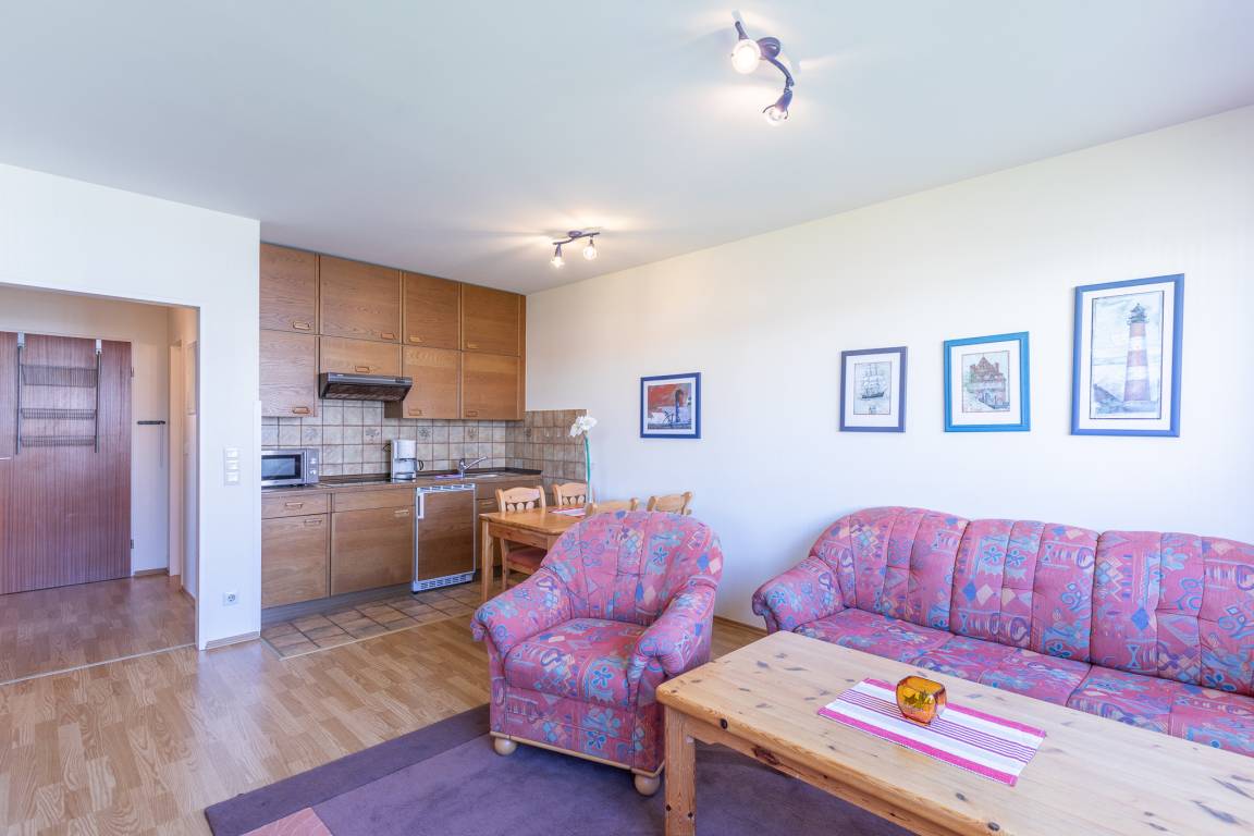 Die Wohnung ist für bis zu 4 Personen ausgestattet. 1 Schlafzimmer mit Doppelbett, 1 Schlafzimmer mit Etagenbetten, ein Wohnzimmer mit 2 Sessel, Flatscreen TV, Essplatz mit 4 Stühlen und Zugang zum Balkon (mit Gartenmöbel), Küchenzeile (Cerankochfeld, Mikrowelle, Dunstabzugshaube, Kaffeemaschine, Wasserkocher, Toaster), 1 Bad mit Dusche und WC, Flur, PKW-Stellplatz am Haus, Nichtraucher, es sind keine Tiere erlaubt.