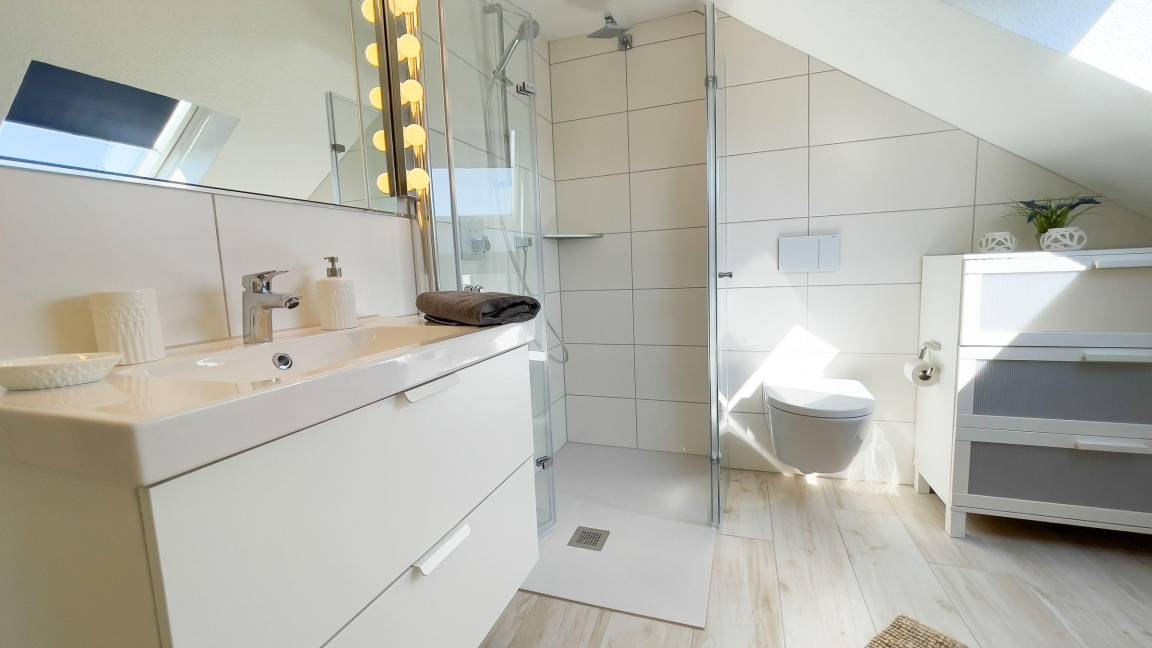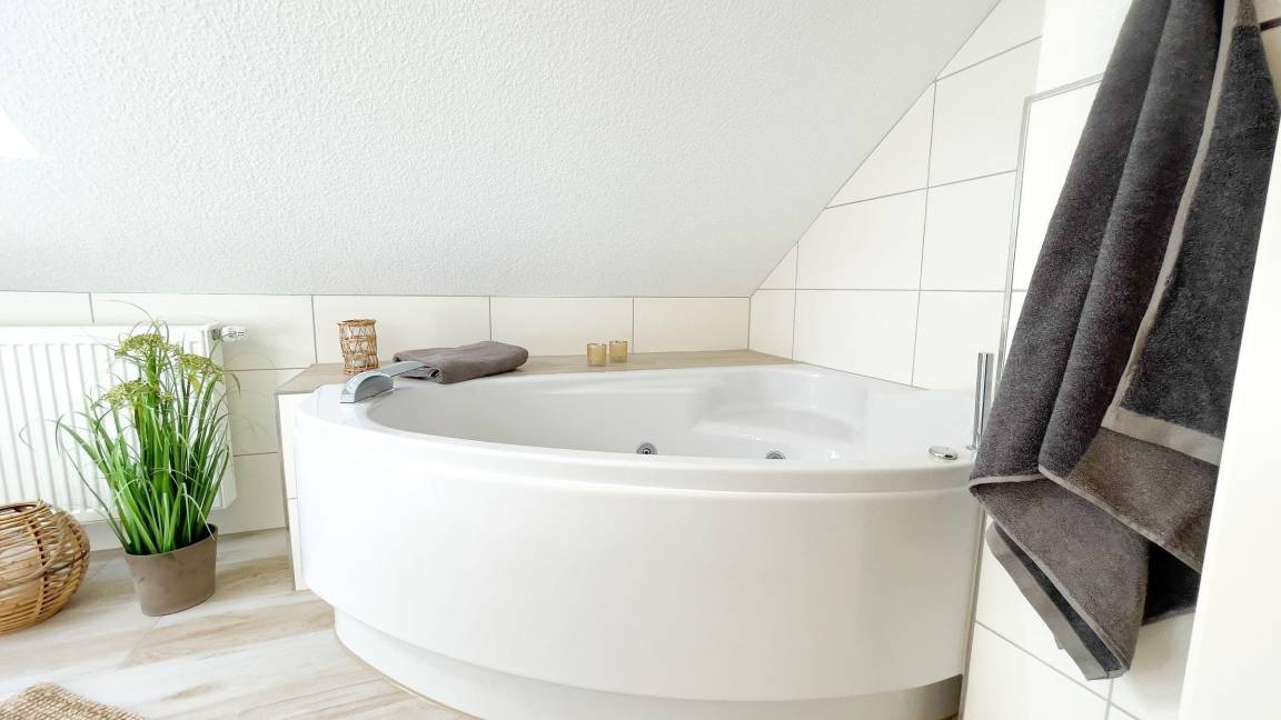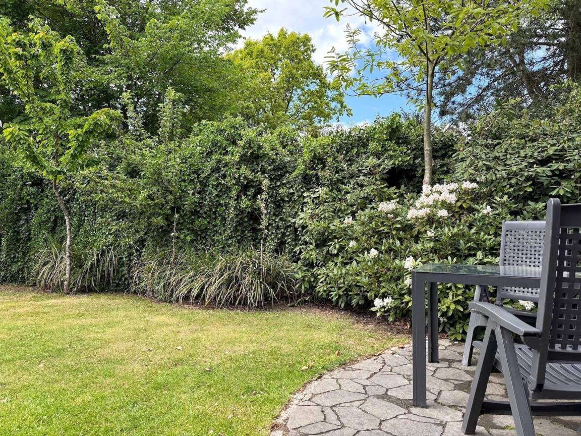 Eine offene Küche bietet moderne Annehmlichkeiten wie Herd, Backofen und Spülmaschine. Ein Esstisch lädt zum Verweilen ein und ermöglicht den Blick auf den Garten. Das großzügige Wellness-Badezimmer verfügt über eine bodengleiche Dusche sowie eine Whirlpool-Badewanne, ideal zum Entspannen nach einem ereignisreichen Tag.