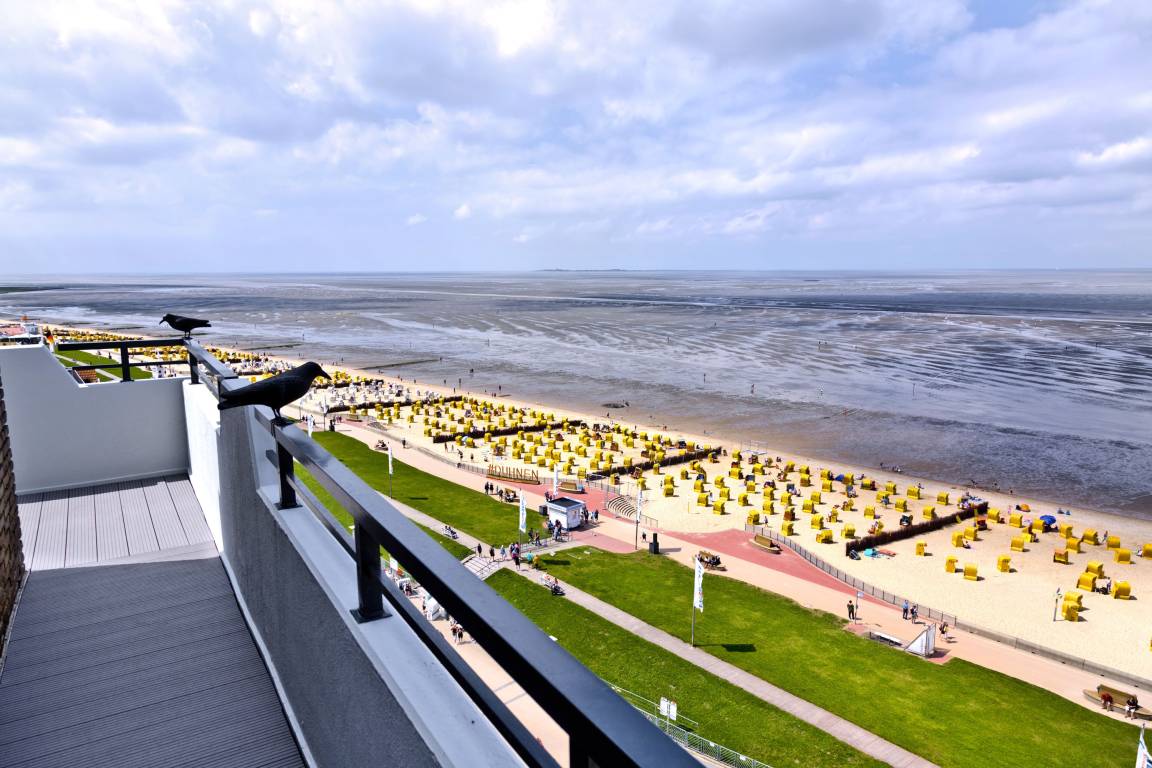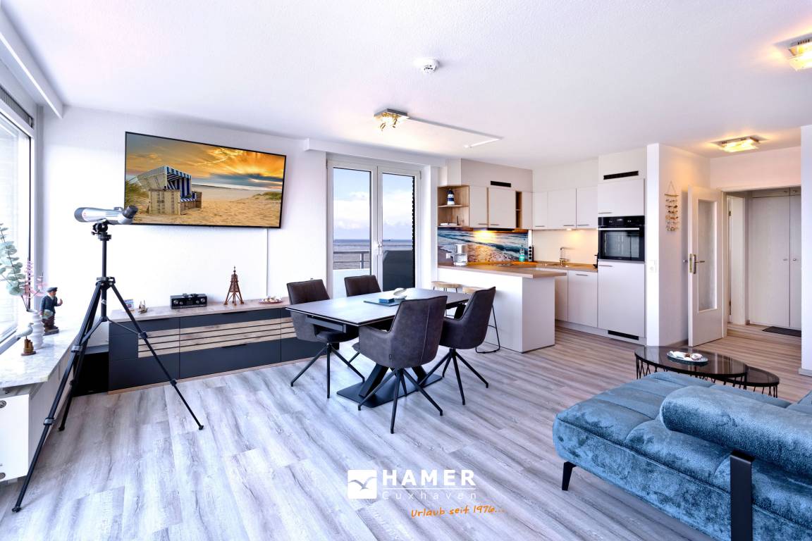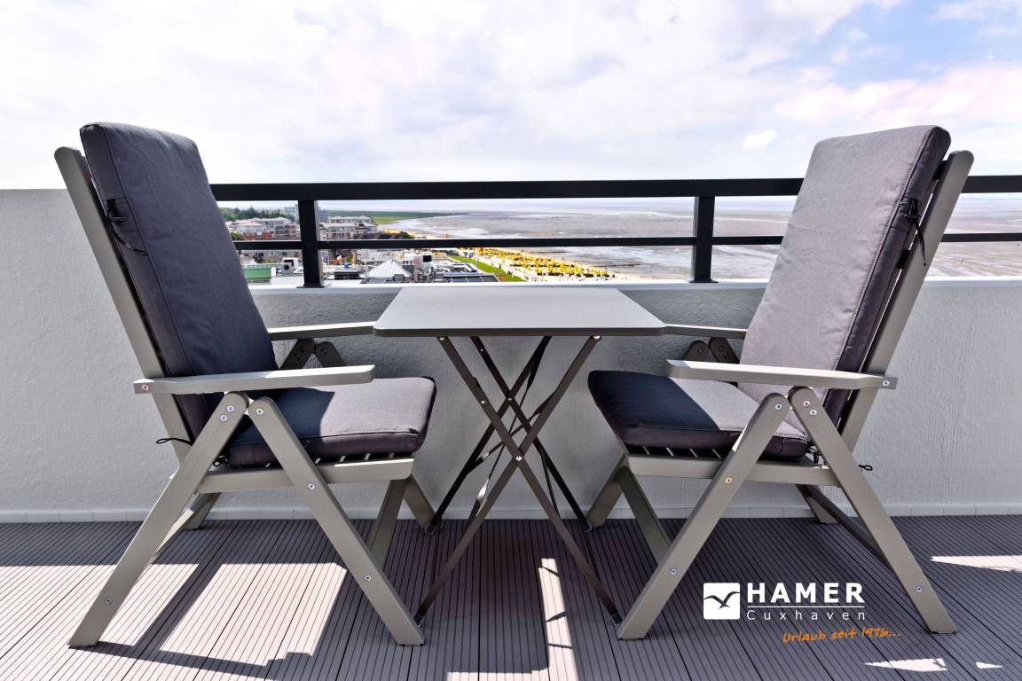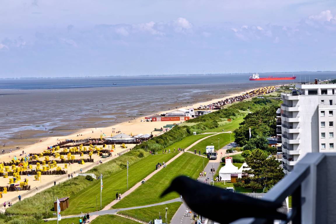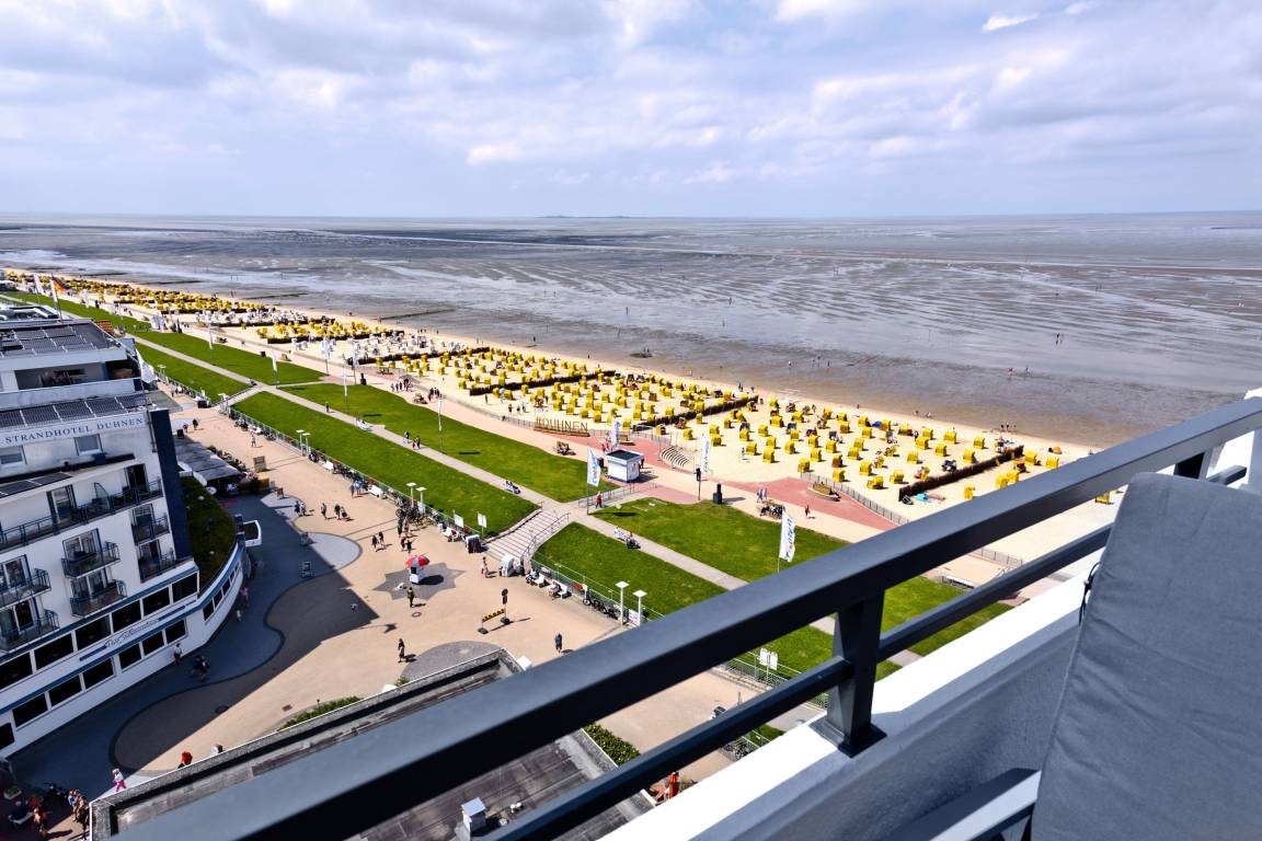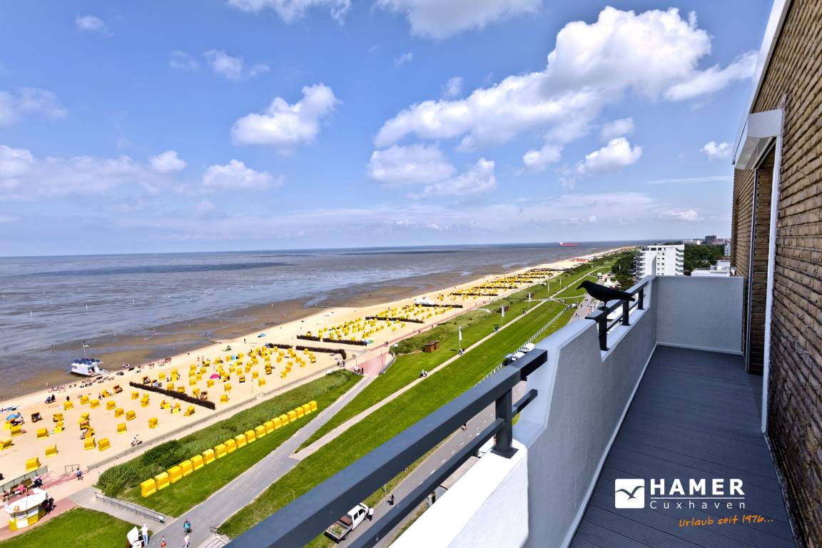 Traum-Wohnung über den Dächern von Duhnen in der 10. Etage mit atemberaubenden Rundum-Seeblick. Keine FeWo in Duhnen liegt höher! Die Ferienwohnung bietet Platz für 2 Personen. Bei einer Größe von ca. 67 m² verfügt die Wohnung über ein Schlafzimmer (Doppelbett 2x2m, 2x Bettwäsche inkl.), ein sehr geräumiges Wohnzimmer (TV, Stereoanlage) mit vollausgestatteter Küchenzeile (Geschirrspüler, 4 Platten Ceran, Backofen, Mikrowelle, Kühlschrank m. 3 Sterne-Gefrierfach und ein sehr schönes Badezimmer (Dusche/WC/Föhn). Alle Räume mit Seeblick und über Außenrollladen verdunkelbar, teilweise mit Insektenschutz.