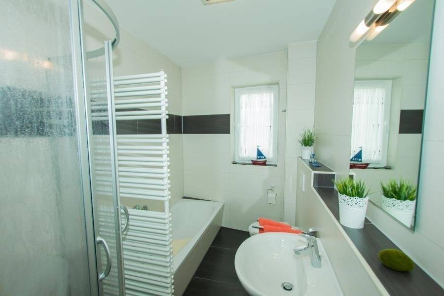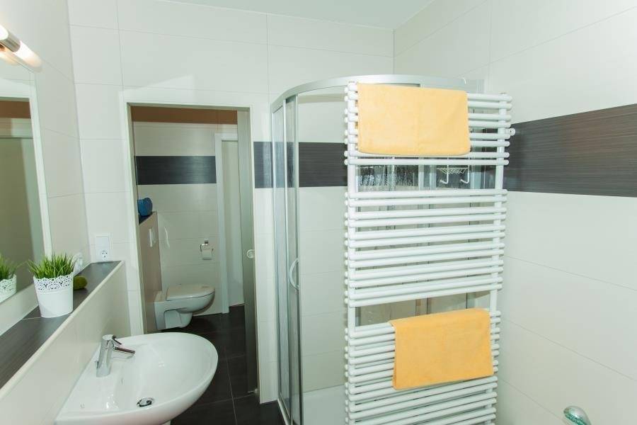 Das Badezimmer verfügt über Tageslicht und Fußbodenheizung. Durch eine Milchglastür kann es in zwei Bereiche unterteilt werden.
