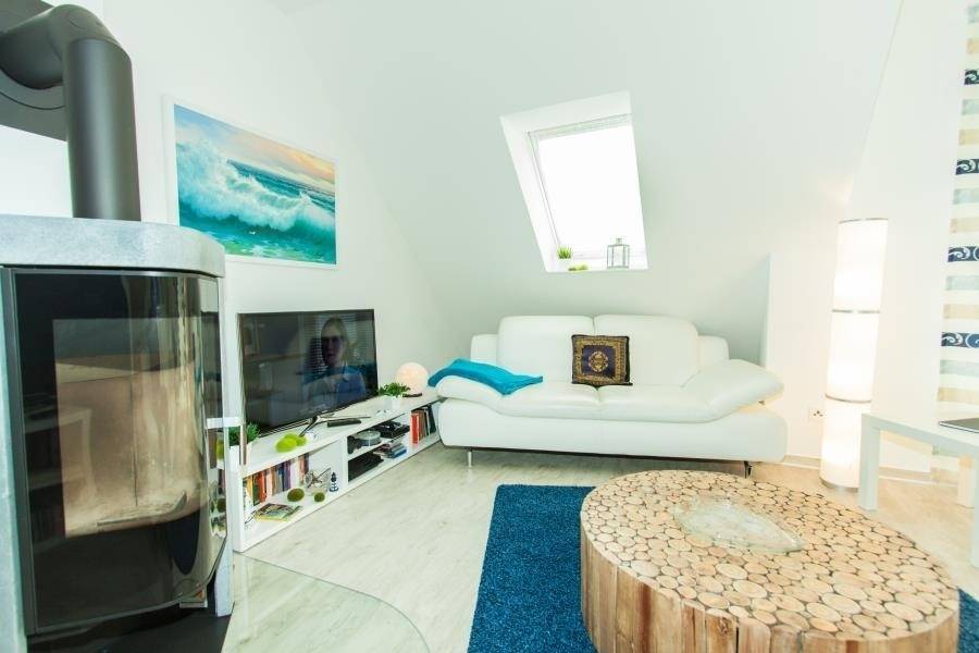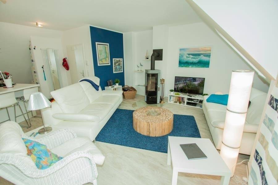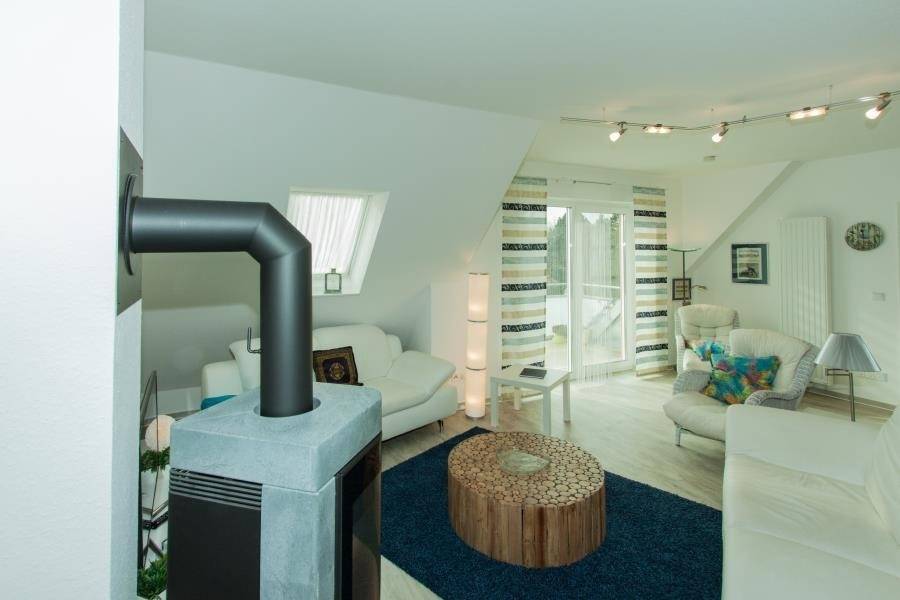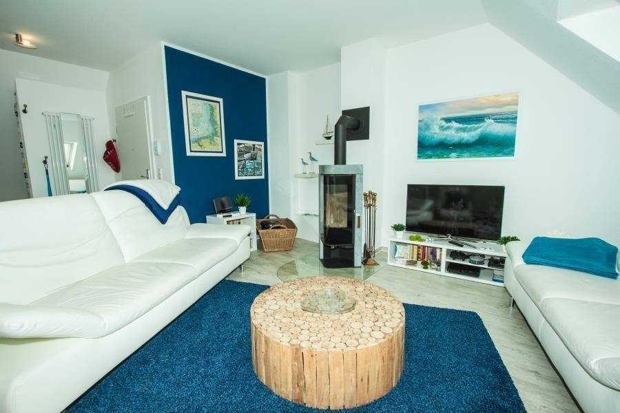 Der Wohnbereich ist großzügig gehalten und bietet mit zwei Sofas, einem Sessel und einem mittig platzierten Kamin einen angenehmen Rahmen für gemeinsame Stunden. Besonders in der kühleren Jahreszeit lassen sich hier ruhige Abende verbringen. Zur Unterhaltung stehen ein TV mit DVD-Player sowie eine PlayStation 4 zur Verfügung. Eine Garderobe befindet sich direkt im Eingangsbereich.