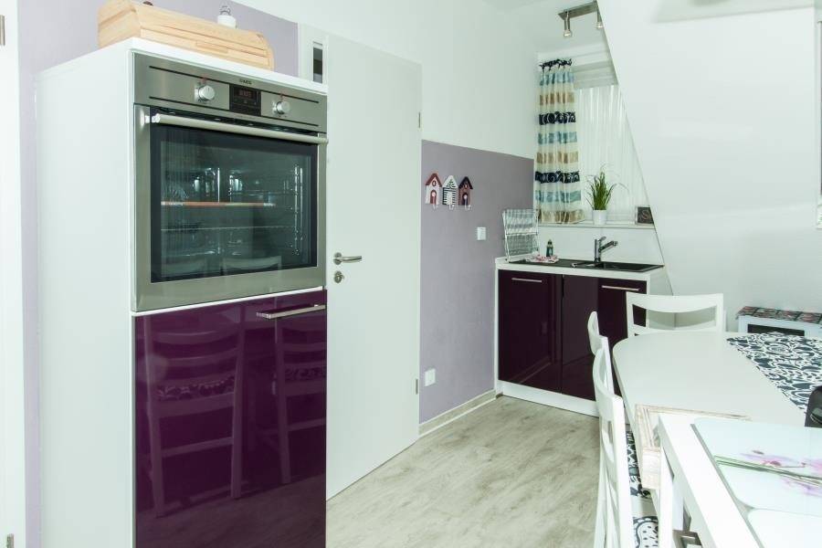 Die offen gestaltete Küche bildet den Mittelpunkt der Wohnung und ist mit dem Essbereich für bis zu vier Personen verbunden. Sie ist praktisch ausgestattet, unter anderem mit Induktionskochfeld, Geschirrspüler und weiteren Küchengeräten, die das Kochen im Urlaub unkompliziert machen.