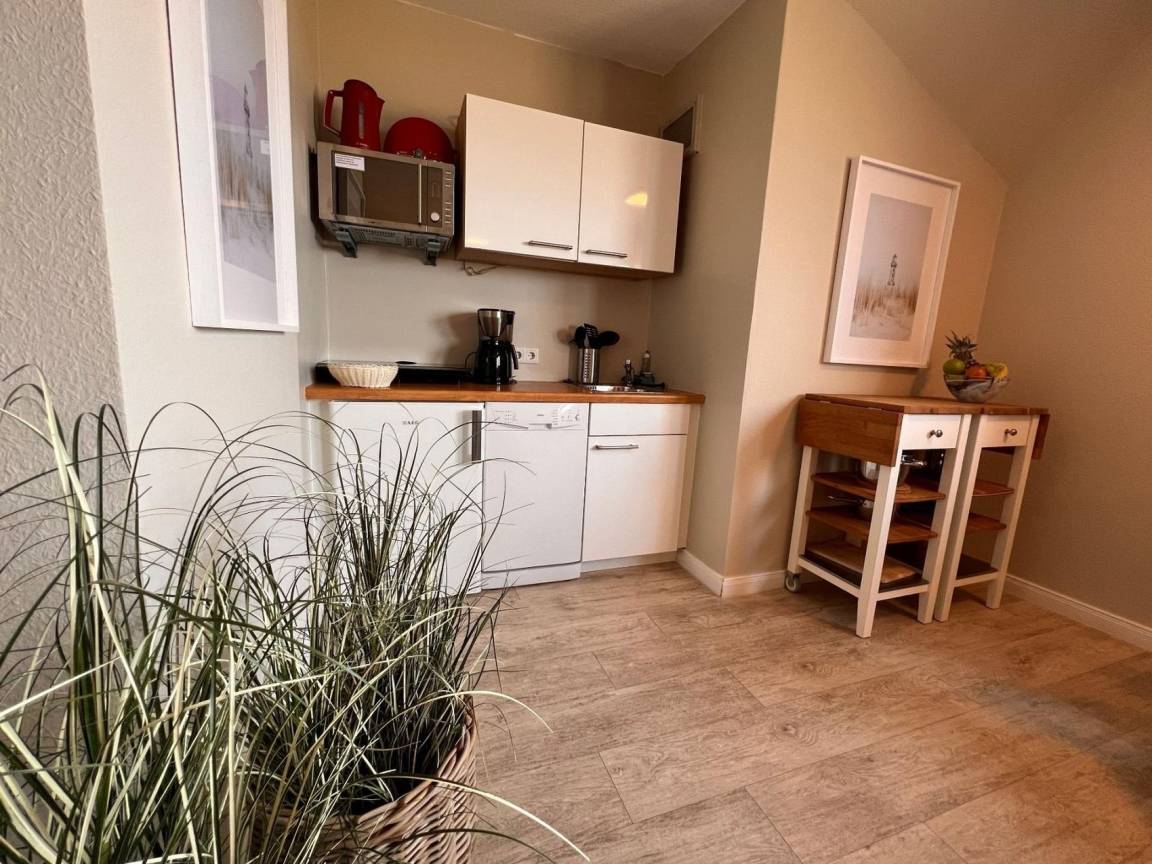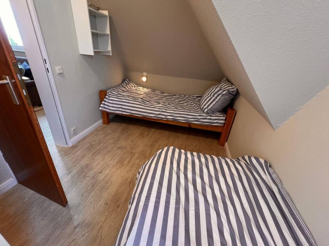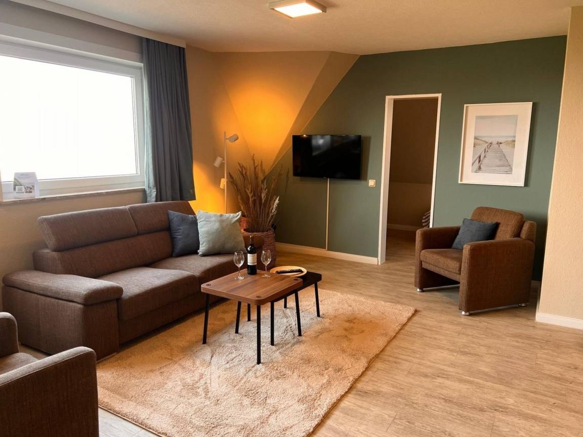 2-Zimmer Appartement im Haus "Nige Wark", bestehend aus einem Schlafzimmer mit zwei Einzelbetten und einem Wohnzimmer. Im Wohnzimmer befindet sich ein gemütliches Zweisitzer-Sofa mit zwei Sesseln und ein Flat- TV sowie die integrierte Küchenzeile mit Spülmaschine, Mikrowelle und Kühlschrank mit Gefrierfach. Der ausziehbare Esstisch bietet genügend Platz für alle. Zusätzlich verfügt das Appartement über ein Schrankbett. Das Badezimmer ist mit einer Dusche und WC ausgestattet.