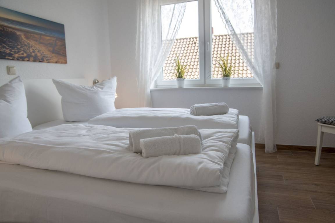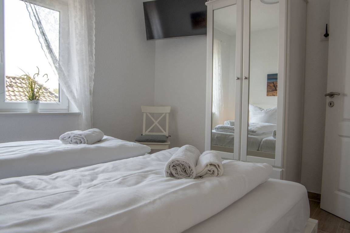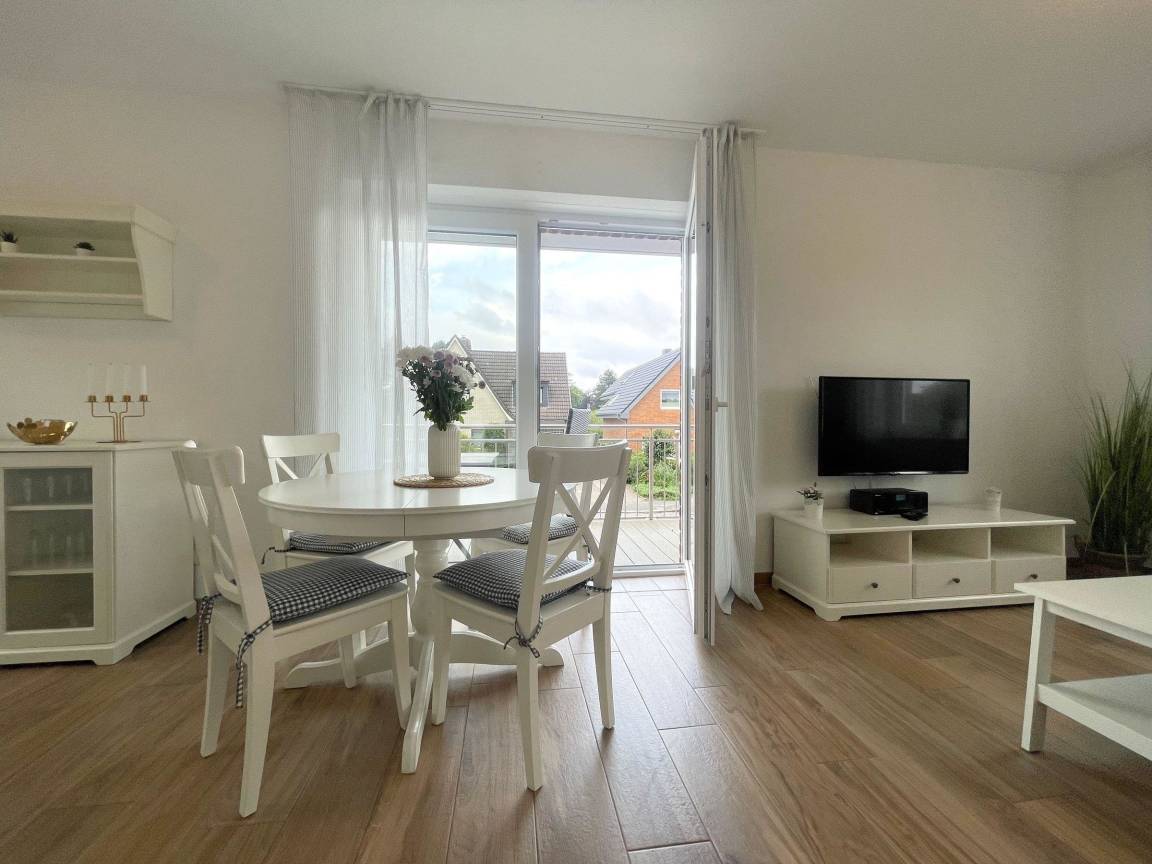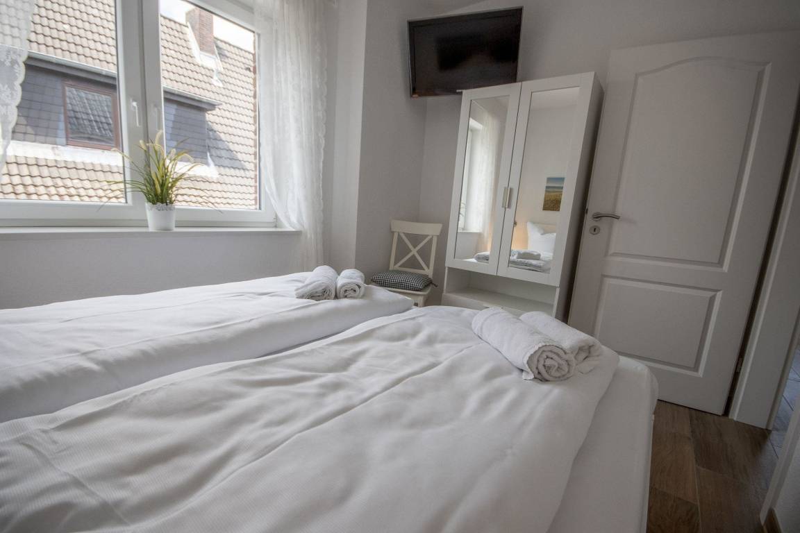 Die exklusive Ferienwohnung in der 1. Etage erstreckt sich über 56 qm und bietet Platz für bis zu 6 Personen. Sie beeindruckt mit hellen, freundlichen Möbeln im nordischen Stil. Die beiden Schlafzimmer sind jeweils mit einem Doppelbett und einem Flatscreen-TV ausgestattet. Im Wohnzimmer befindet sich eine aufklappbare Schlafcouch, ideal für zusätzliche Gäste. Die offene Küchenzeile verfügt über moderne Geräte wie Geschirrspüler, Induktionsherd, Mikrowelle, Backofen, Kaffeemaschine und Wasserkocher und lädt zum gemeinsamen Kochen ein. Das großzügige Badezimmer ist mit einer bodengleichen Walk-In-Dusche ausgestattet. Zusätzlich gehört ein Balkon mit Möbeln zur Wohnung, der zur Entspannung einlädt. Restaurants, Geschäfte und der schöne Sandstrand von Duhnen sind nur wenige Gehminuten entfernt.