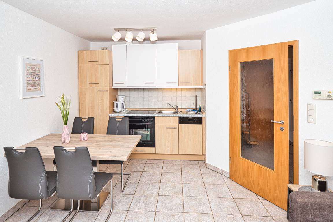 Ein helles Duschbad/WC, ein Wohnbereich mit Essbereich und moderner Einbauküche sowie der Zugang zum sonnigen Balkon vervollständigen das Angebot. Der gemütliche Balkon mit Balkonmöbeln lädt zum Entspannen und Urlauben ein, während Sie die frische Luft und die schöne Umgebung genießen können.