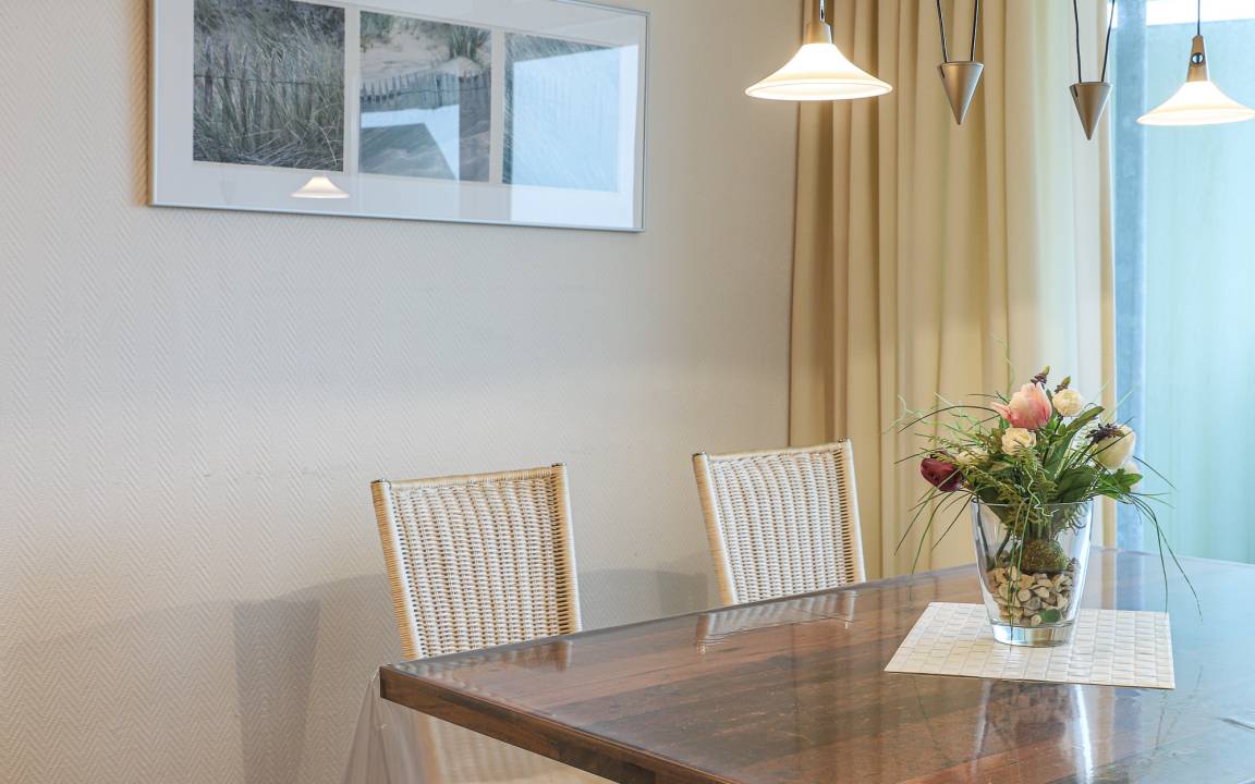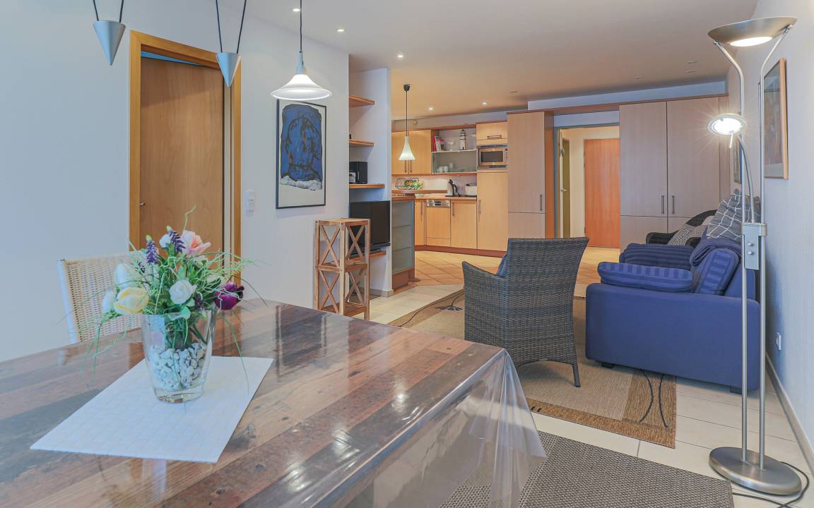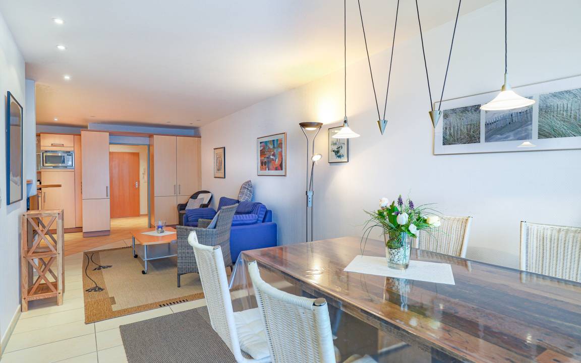 Der großzügige Wohn-, Ess- und Küchenbereich ist offen gestaltet und freundlich eingerichtet. Große Fenster sorgen für viel Tageslicht und ermöglichen einen schönen Blick auf das Meer. Der Wohnbereich bietet eine gemütliche Sitzgelegenheit sowie TV und Radio und lädt zu entspannten Stunden nach einem Strandspaziergang ein. Der Essplatz ist harmonisch in den Raum integriert und bietet ausreichend Platz für gemeinsame Mahlzeiten.