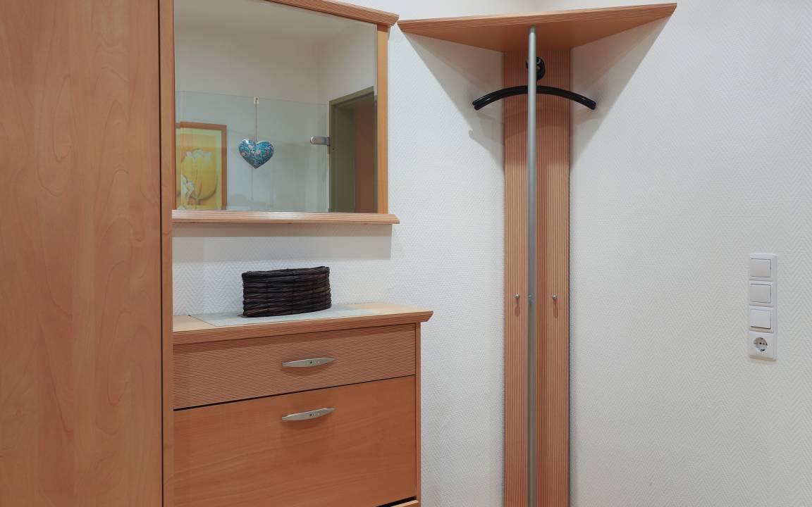 Das hell geflieste Duschbad mit WC ist freundlich gestaltet und verfügt über eine geräumige Dusche sowie ausreichend Ablageflächen. Der Eingangsbereich der Wohnung ist ebenfalls hell gehalten und mit einer praktischen Garderobe ausgestattet.