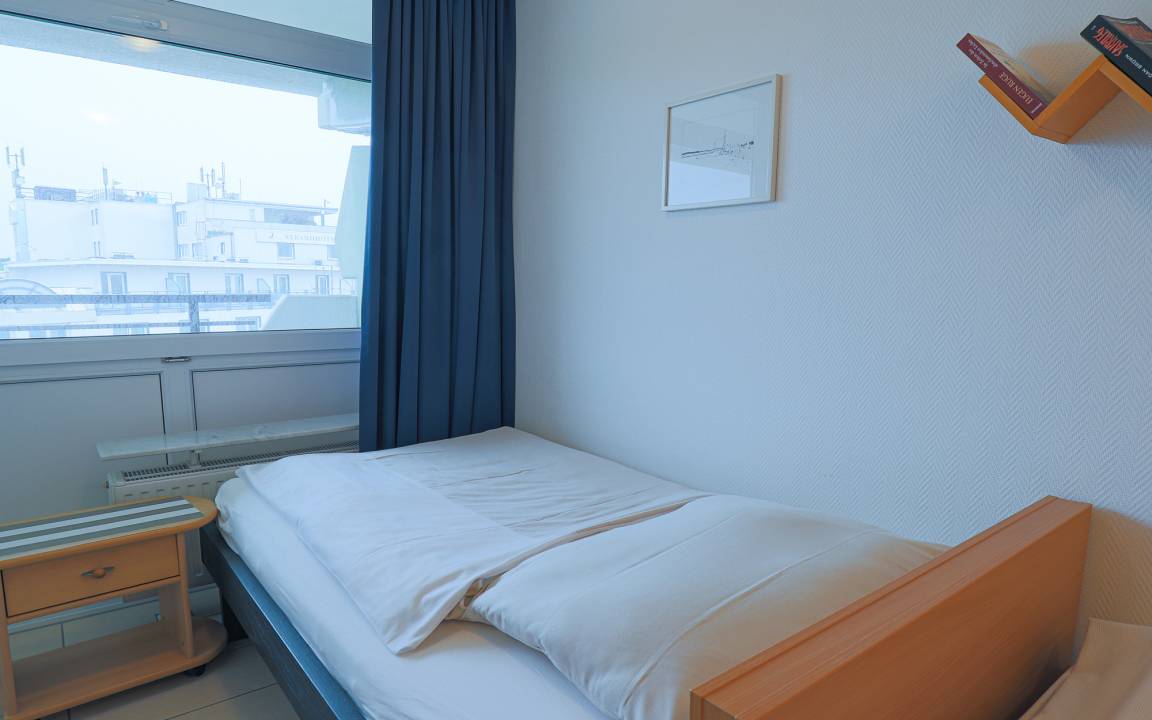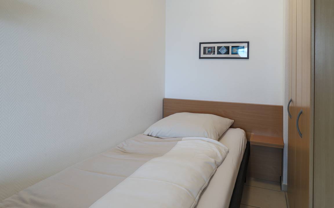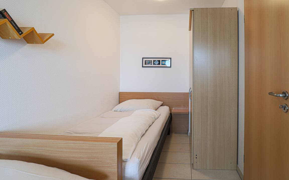 Das separate Schlafzimmer ist mit zwei Einzelbetten ausgestattet und bietet eine ruhige Schlafumgebung. Auch hier sorgt die Lage im oberen Stockwerk für eine angenehme Atmosphäre. Bei Ihrer Anreise sind die Betten selbstverständlich frisch bezogen, sodass Sie Ihren Aufenthalt direkt entspannt beginnen können.