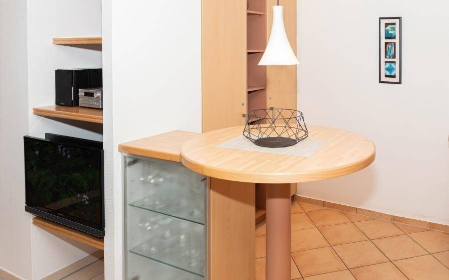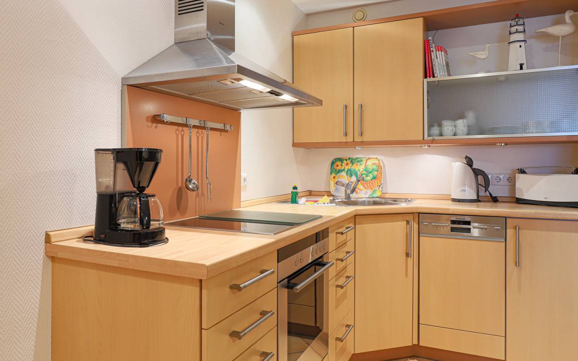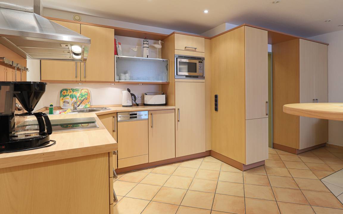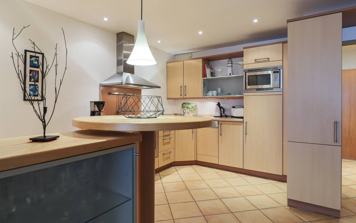 Die funktional ausgestattete Küchenzeile ist ideal für die Selbstverpflegung im Urlaub. Sie verfügt über einen Geschirrspüler, eine Mikrowelle sowie einen Kühlschrank mit Gefrierfach. So lassen sich sowohl das Frühstück als auch einfache Mahlzeiten bequem zubereiten. Alternativ erreichen Sie zahlreiche Restaurants, Cafés und Einkaufsmöglichkeiten direkt vor der Haustür des Panoramahauses.