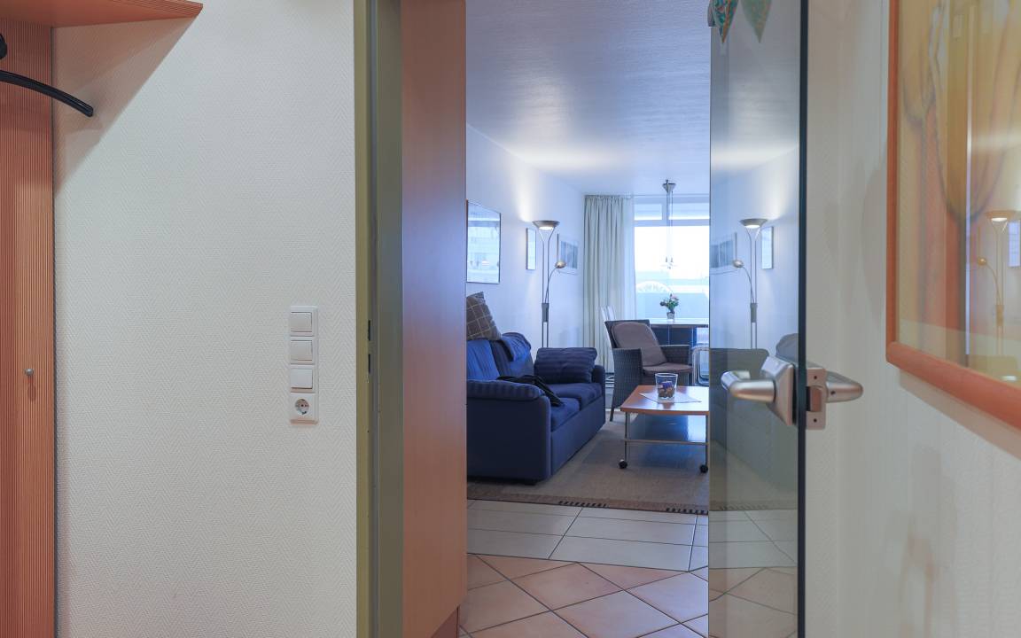 Die Wohnung ist bequem mit dem Aufzug erreichbar – auch direkt aus der Tiefgarage – und eignet sich besonders für Gäste, die eine unkomplizierte Ferienwohnung mit Meerblick und zusätzlichen Annehmlichkeiten im Haus schätzen.