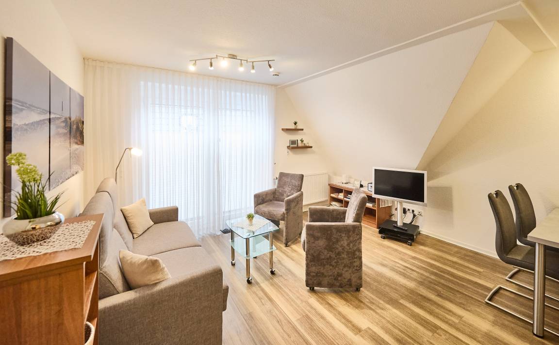 Herzlich willkommen in dieser sehr gemütlichen 3-Raum Maisonette Ferienwohnung über 2 Etagen, die Ihre Erwartungen übertreffen wird. Die sehr gute Ausstattung präsentiert sich mit einem ansprechenden Wohn- und Essbereich, einer vollständig eingerichteten Küchenzeile inklusive hochwertiger Siemens-Einbaugeräte und direktem Zugang zum großzügigen Südwest-Balkon. Dieser ist mit erstklassigen Kettler Balkonmöbeln ausgestattet, und als Sonnenschutz erwartet Sie eine elektrische Sonnenschutzmarkise. Der Balkon ist auch vom Schlafzimmer aus zugänglich, welches mit einem Doppelbett und einem großzügigen Kleiderschrank eingerichtet ist.