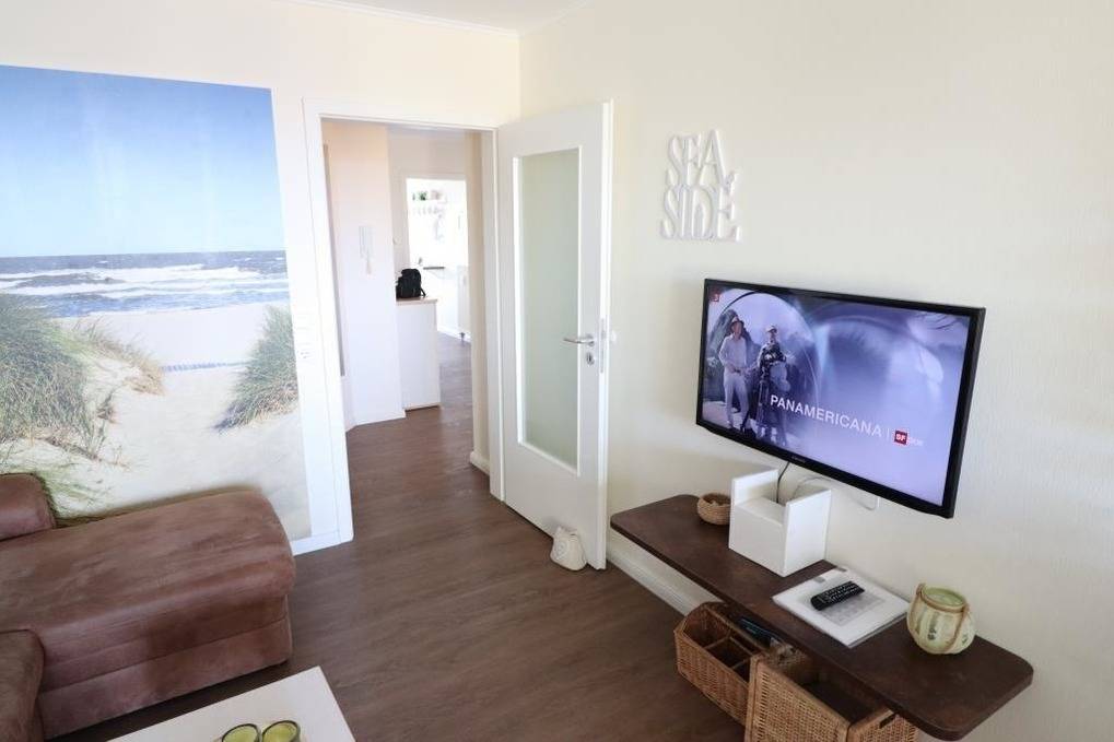 Die Ferienwohnung D3.1 im Haus Nordeebrandung bietet auf ca. 71 qm Platz für bis zu 4 Personen. Sie verfügt über zwei Schlafzimmer: eines mit einem Doppelbett (1,80 m x 2 m) und einem TV-Gerät sowie ein weiteres mit einem Einzelbett und einem Einzelschrankbett (0,90 m x 2 m), ausgestattet mit einem weiteren TV-Gerät. Der gemütliche Wohnraum bietet Seesicht und einen Esstisch, während die separate gut ausgestattete Küche zum Kochen einlädt. Das renovierte Badezimmer ist mit Dusche und WC ausgestattet. Zusätzlich stehen zwei Balkone zur Verfügung, und ein Kinderhochstuhl ist kostenlos vorhanden. WLAN kann kostenlos genutzt werden, und ein Parkplatz in der Tiefgarage ist inklusive. Waschmaschine und Trockner finden sich gegen Gebühr im Keller von Eingang A. Hunde sind in dieser Nichtraucherwohnung nicht gestattet.