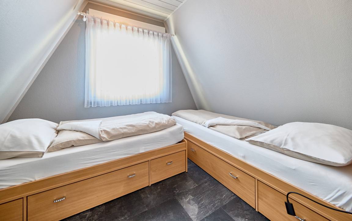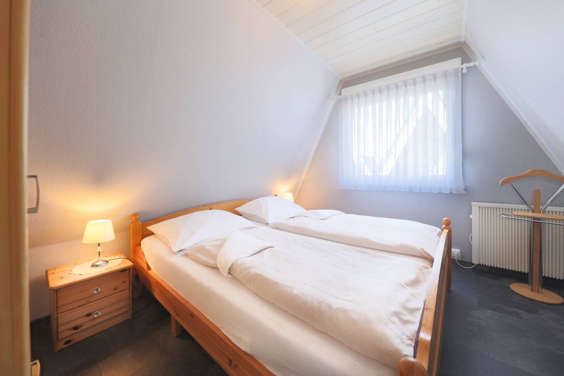 Im Obergeschoss befinden sich das Schlafzimmer mit einem bequemen Ehebett und ein Kinderzimmer mit zwei Einzelbetten. Hier können Sie sich nach einem erlebnisreichen Tag ausruhen und erholsamen Schlaf finden. Das gesamte Haus ist liebevoll eingerichtet und bietet Ihnen ein behagliches Ambiente für Ihre Ferien.