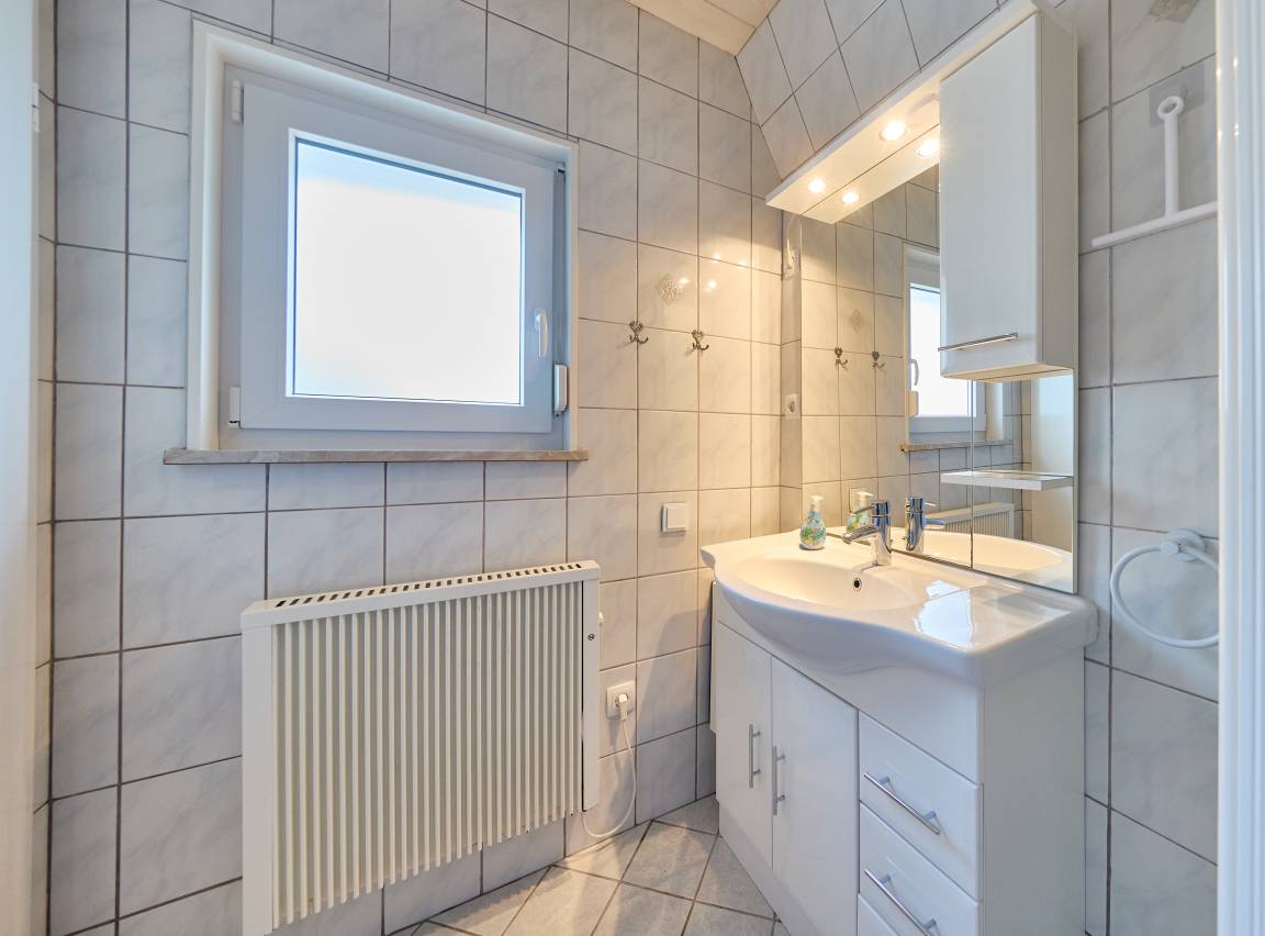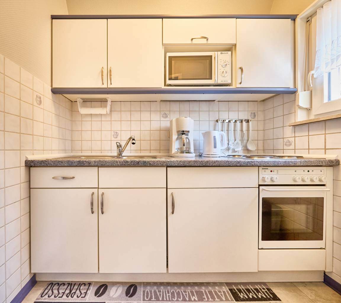 Im Erdgeschoss des Ferienhauses finden Sie eine gemütliche Küche, ein Wohnzimmer und ein Duschbad. Die Küche ist mit einem 4-Plattenherd, Kühlschrank, Kaffeemaschine, Toaster, Wasserkocher und Mikrowelle ausgestattet. Hier können Sie Ihre Lieblingsgerichte zubereiten und gemeinsam an der Essecke für 4 Personen speisen. Das Wohn-Esszimmer verfügt zudem über ein komfortables Sofa und einen Fernseher mit Kabelanschluss. An den Fenstern des Hauses sind Rollläden angebracht, die Ihnen Privatsphäre und eine angenehme Verdunkelung bieten.