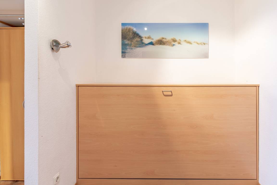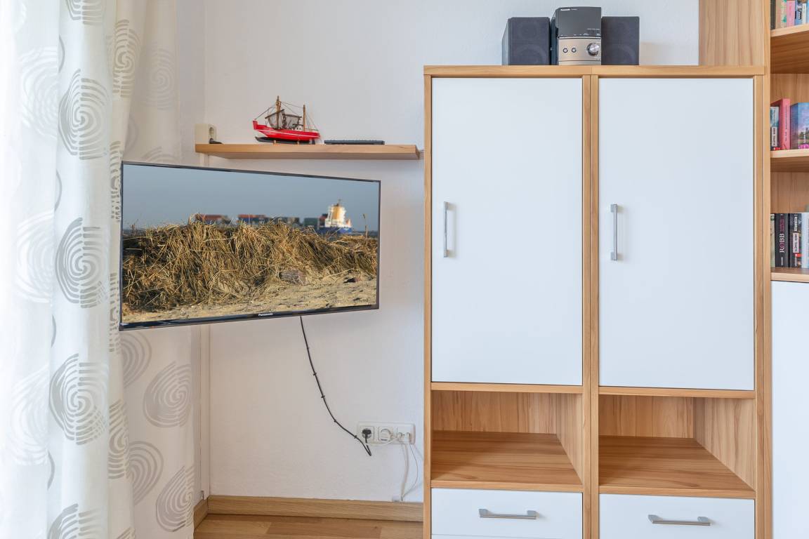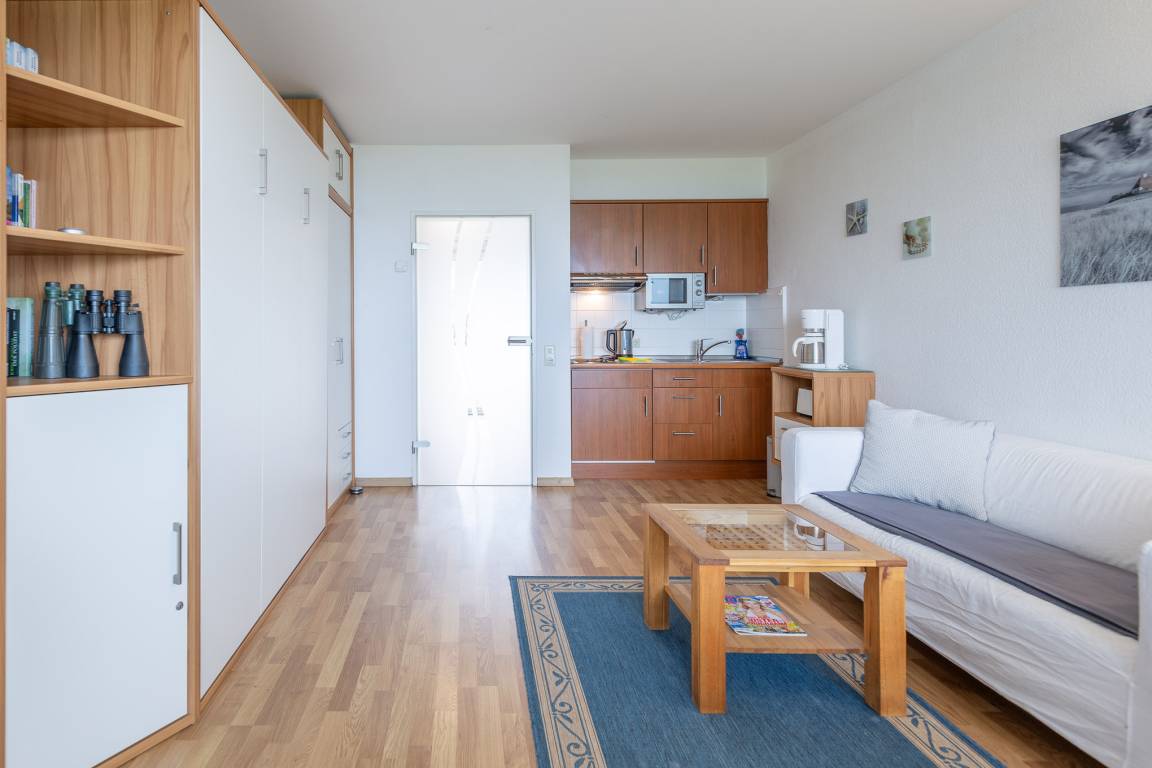 Der Esstisch am Fenster gewährleistet, dass Sie schon beim allmorgendlichen Kaffee den faszinierenden Meerblick auf die vorbeifahrenden Großsegler, Kutter und Kreuzfahrtschiffe genießen können. Ein LCD Fernseher sorgt dafür, dass Sie auch im Urlaub nicht auf Ihre Lieblingsserie verzichten müssen. Eine Küchenzeile ist im Wohnbereich integriert.