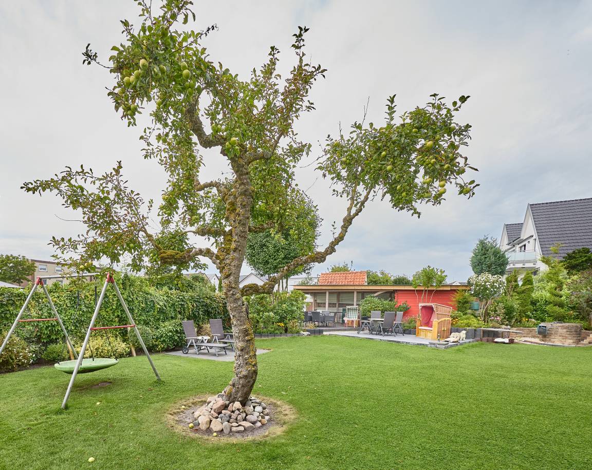 Großer Gemeinschaftsgarten mit Terrasse, Gartenmöbeln und Strandkörben