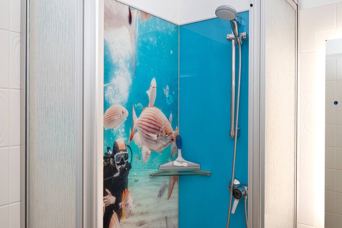 Zwei Schlafbereiche mit komfortablen Doppelbetten bieten erholsame Nächte. Das Badezimmer/WC ist mit Dusche und Fön ausgestattet.