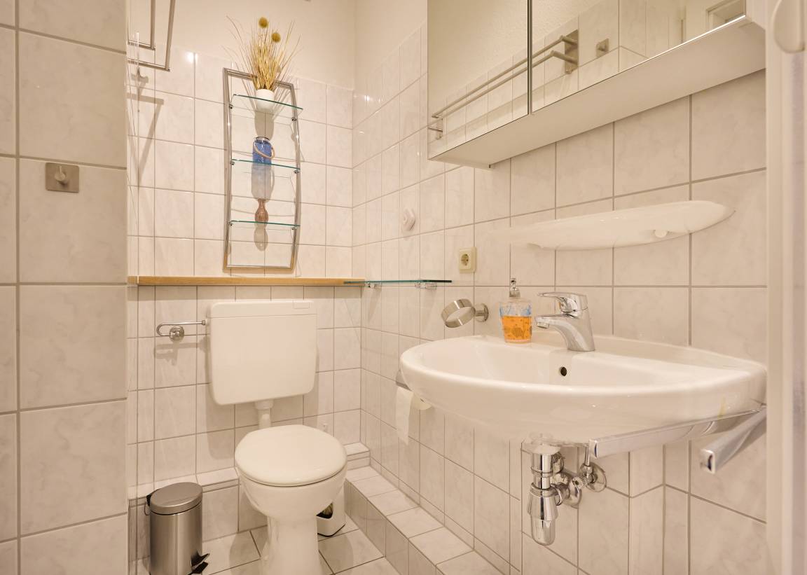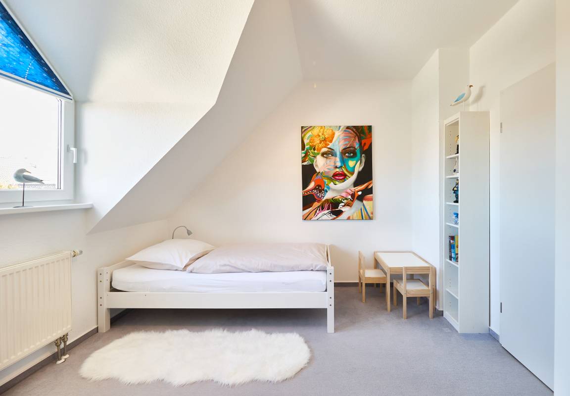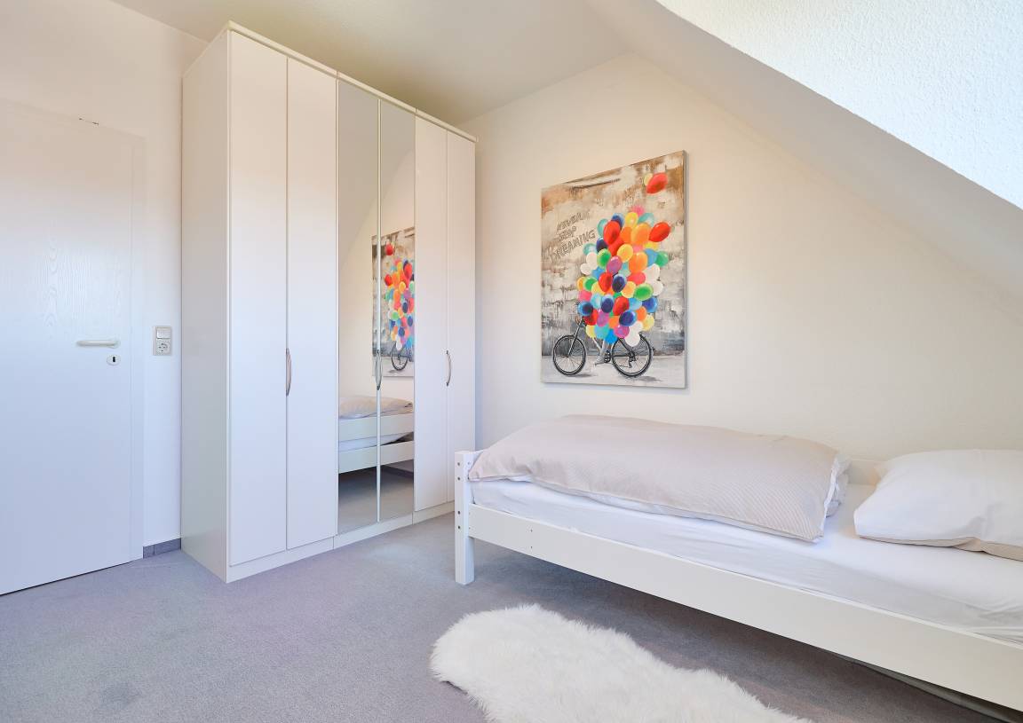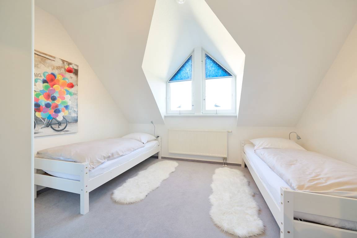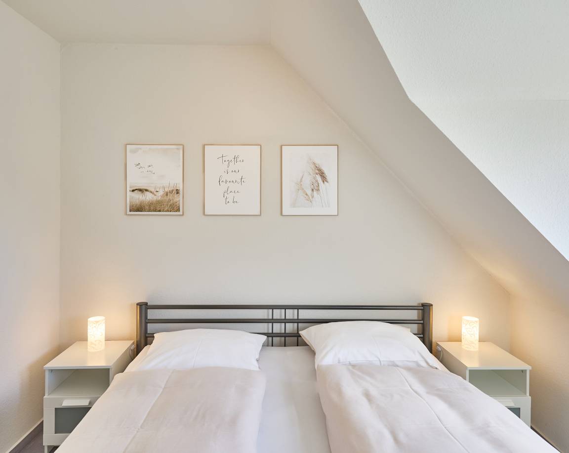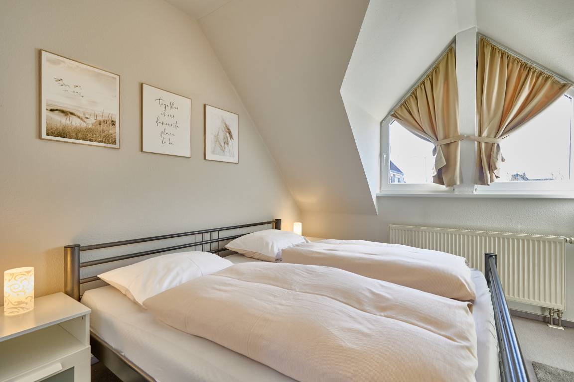 Im Obergeschoss befinden sich zwei Schlafzimmer. Das Elternschlafzimmer ist mit einem extra breiten Doppelbett ausgestattet und verfügt zusätzlich über ein zweites TV-Gerät mit digitalen Sendern und Streaming-Angeboten. Im zweiten Schlafzimmer stehen zwei Einzelbetten zur Verfügung. Auf dieser Etage befindet sich auch das Duschbad mit WC. Im Erdgeschoss befindet sich zusätzlich ein Gäste-WC.