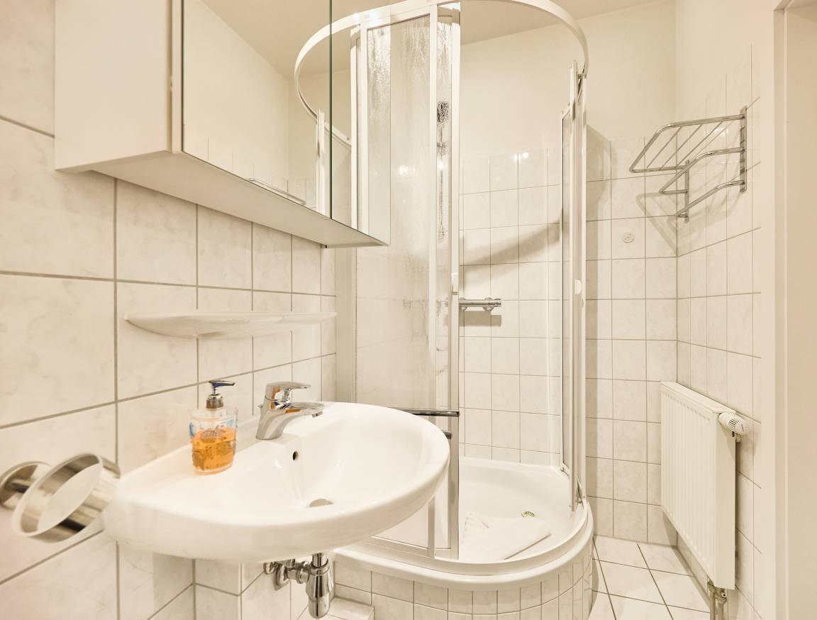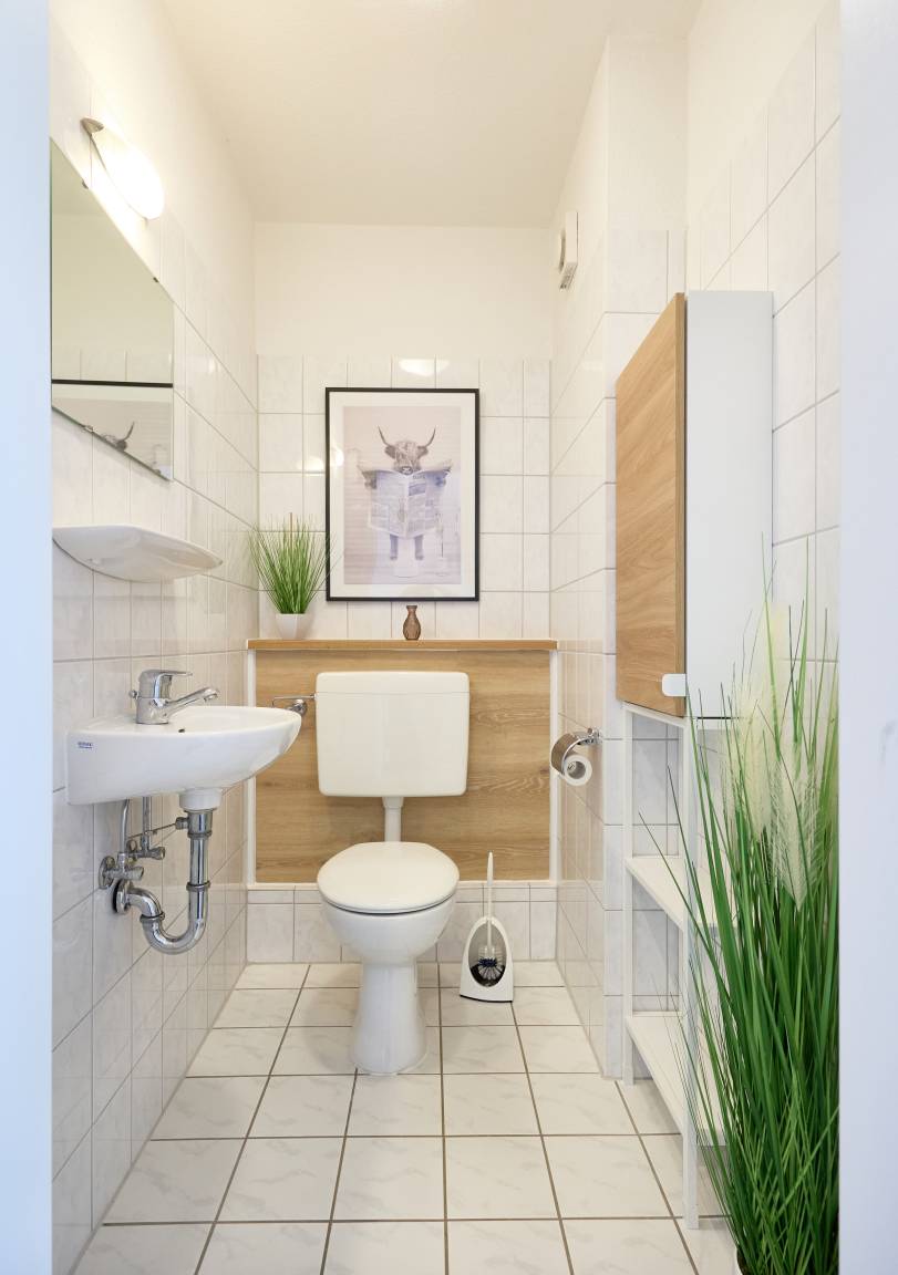 Im Erdgeschoss erwartet Sie eine separate, voll ausgestattete Küche, die neben einem Geschirrspüler und einer Waschmaschine auch einen Kaffeevollautomaten bietet. Das helle Wohnzimmer mit Essbereich lädt zum Verweilen ein und kann durch elektrische Rollläden abgedunkelt werden. Von hier aus haben Sie direkten Zugang zur Terrasse und zum Garten. Unter der Treppe befindet sich ein Vorratsraum als zusätzlicher Abstellbereich. Eine Garderobe sowie ein Gäste-WC runden das Raumangebot im Erdgeschoss ab.