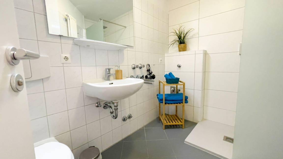 Die helle und moderne Ferienwohnung in der 1. Etage bietet auf rund 63 m² Platz für bis zu 4 Personen. Ein separates Schlafzimmer mit einem komfortablen Doppelbett sorgt für erholsamen Schlaf, während die Schlafcouch im Wohnzimmer Platz für weitere Gäste bietet. Die voll ausgestattete Küchenzeile, inklusive Geschirrspüler, lädt zum gemeinsamen Kochen ein. Das Bad verfügt über eine ebenerdige, begehbare Dusche. Ein möblierter Balkon mit seitlichem Meerblick lädt zum Entspannen ein. Im Keller stehen Münz-Waschmaschinen und Trockner zur gemeinschaftlichen Nutzung bereit. Gäste können ihre Fahrräder im Fahrradkeller abstellen. Die Wohnung befindet sich nur etwa 200 Meter vom Sahlenburger Sandstrand und der Promenade entfernt, was sie zum idealen Ausgangspunkt für einen entspannten Nordseeurlaub macht.