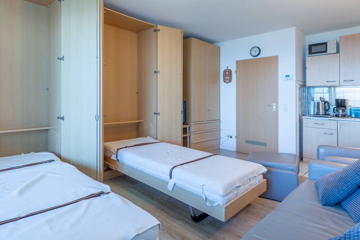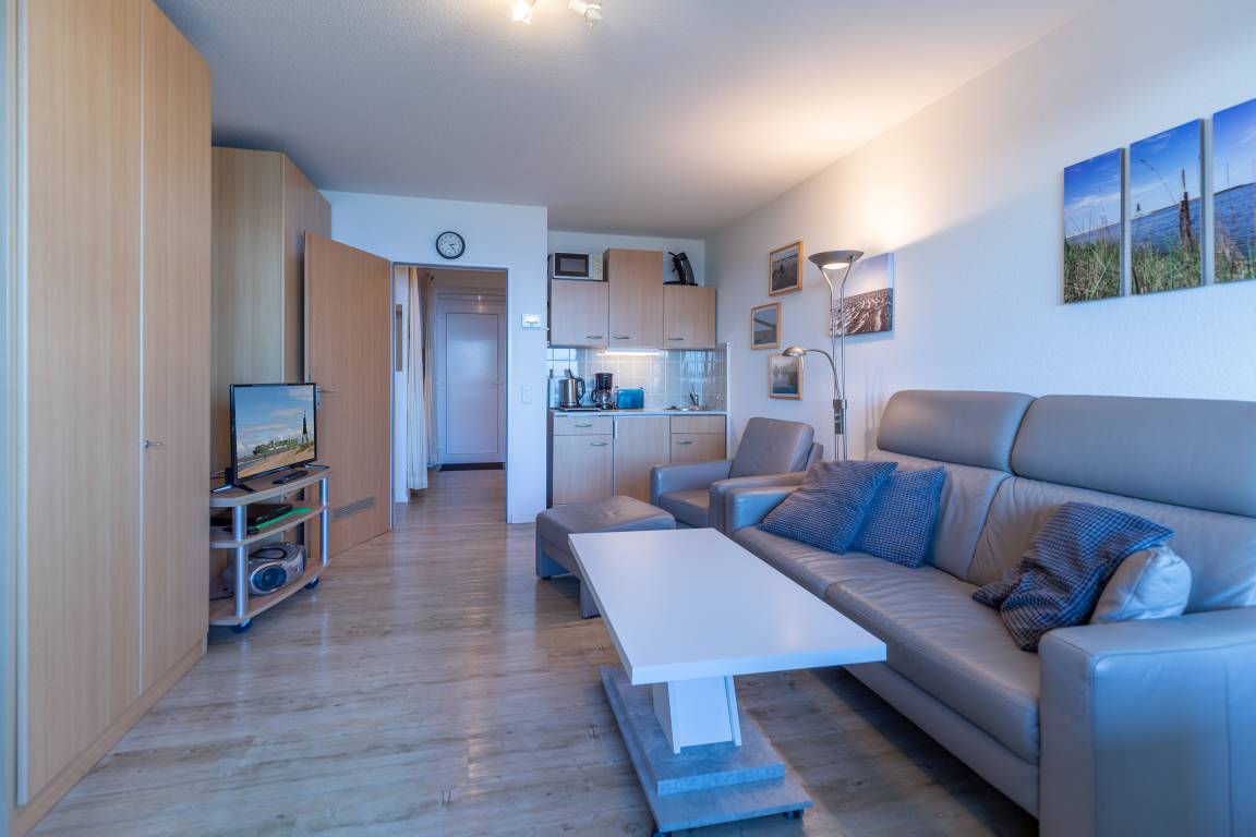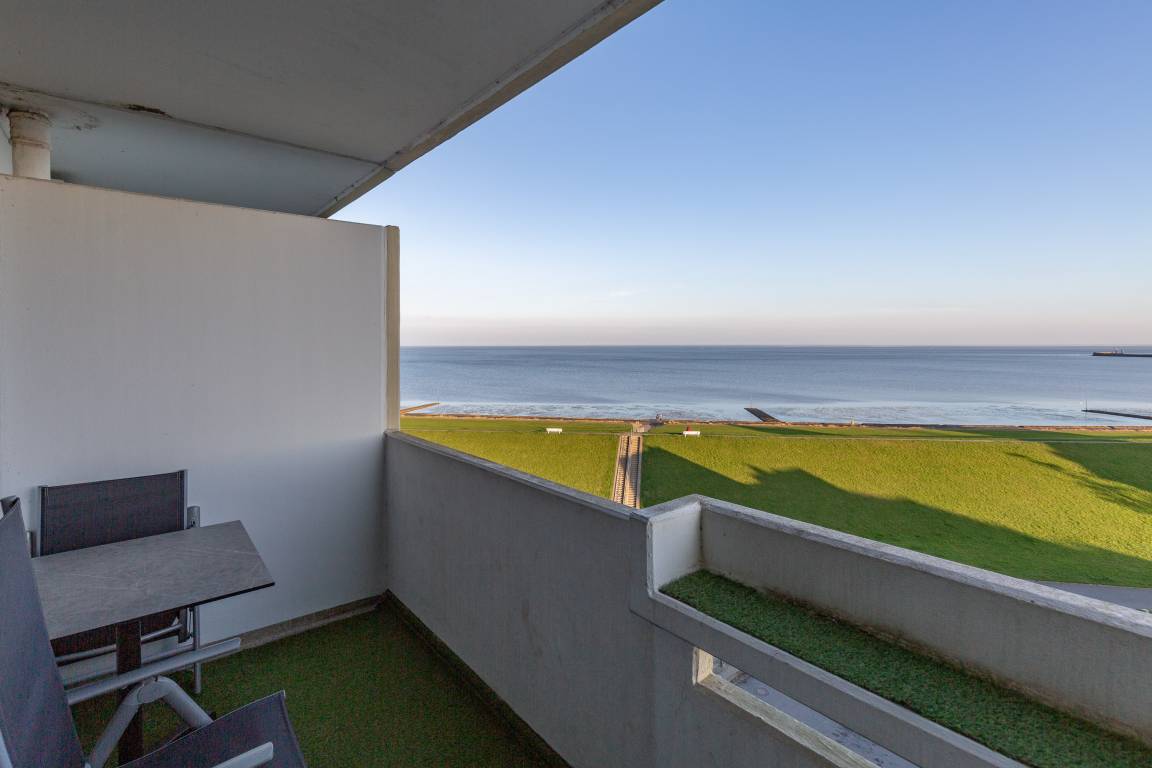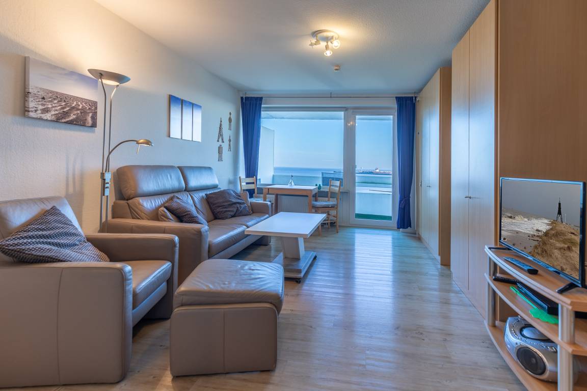 Morgens aufwachen, das Meeresrauschen hören und den Blick über den Schifffahrtsweg schweifen lassen. In dieser 35 m² großen Ferienwohnung im 6. Obergeschoss beginnt jeder Urlaubstag mit einem besonderen Moment. Die Wohnung bietet Platz für bis zu 3 Personen und überzeugt vor allem durch den beeindruckenden Meerblick, den Sie sowohl vom Wohnbereich als auch vom möblierten Balkon genießen können.