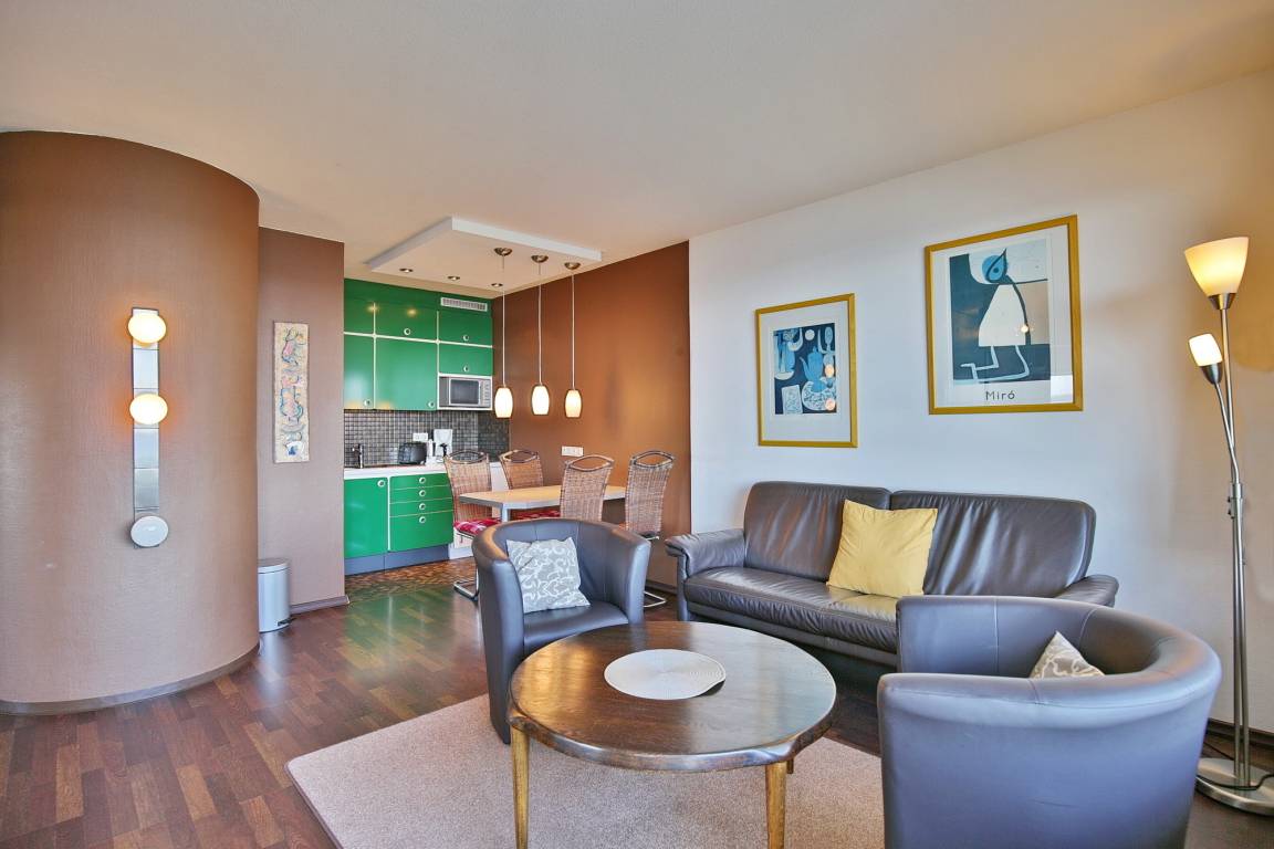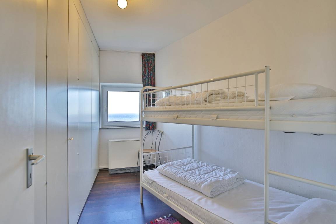 Die 2,5-Zimmer Ferienwohnung besticht durch ein gemütliches Ambiente. Das komfortable Doppelbett gewährleistet, dass Sie sich auch im Schlaf erholen. Darüber hinaus steht ein separates Schlafzimmer mit Etagenbett zur Verfügung. Das komfortable Sofa lädt zum Verweilen ein. Dank LCD-Fernseher sehen Sie auch im Urlaub Ihre Lieblingsserie und die Sportschau. Eine kleine Küchenzeile ist im Wohnbereich integriert.