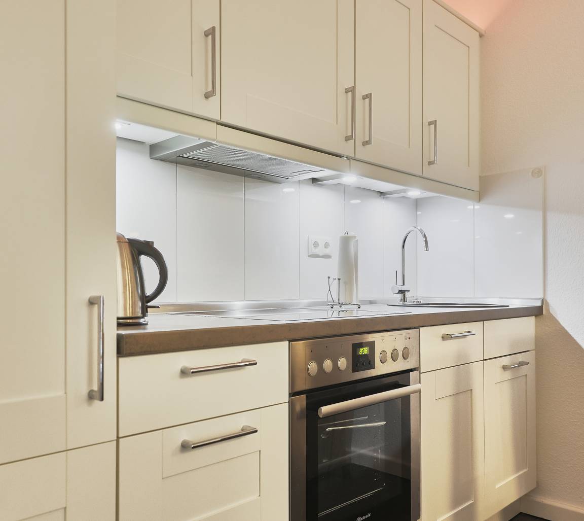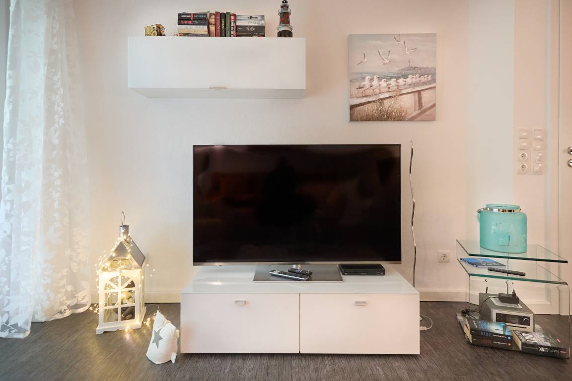 Der Wohn-, Küchen- und Essbereich ist mit einer komfortablen Einbauküche inklusive Geschirrspüler ausgestattet. Der Esstisch mit 4 Stühlen lädt zum gemeinsamen Mahl ein, während das Sofa mit einem Sessel zum Entspannen einlädt. Vom Wohnbereich aus gelangen Sie auf den Balkon, der Ihnen ebenfalls eine kleine Aussicht auf das Meer bietet und am Strandpalais Duhnen vorbeiführt.