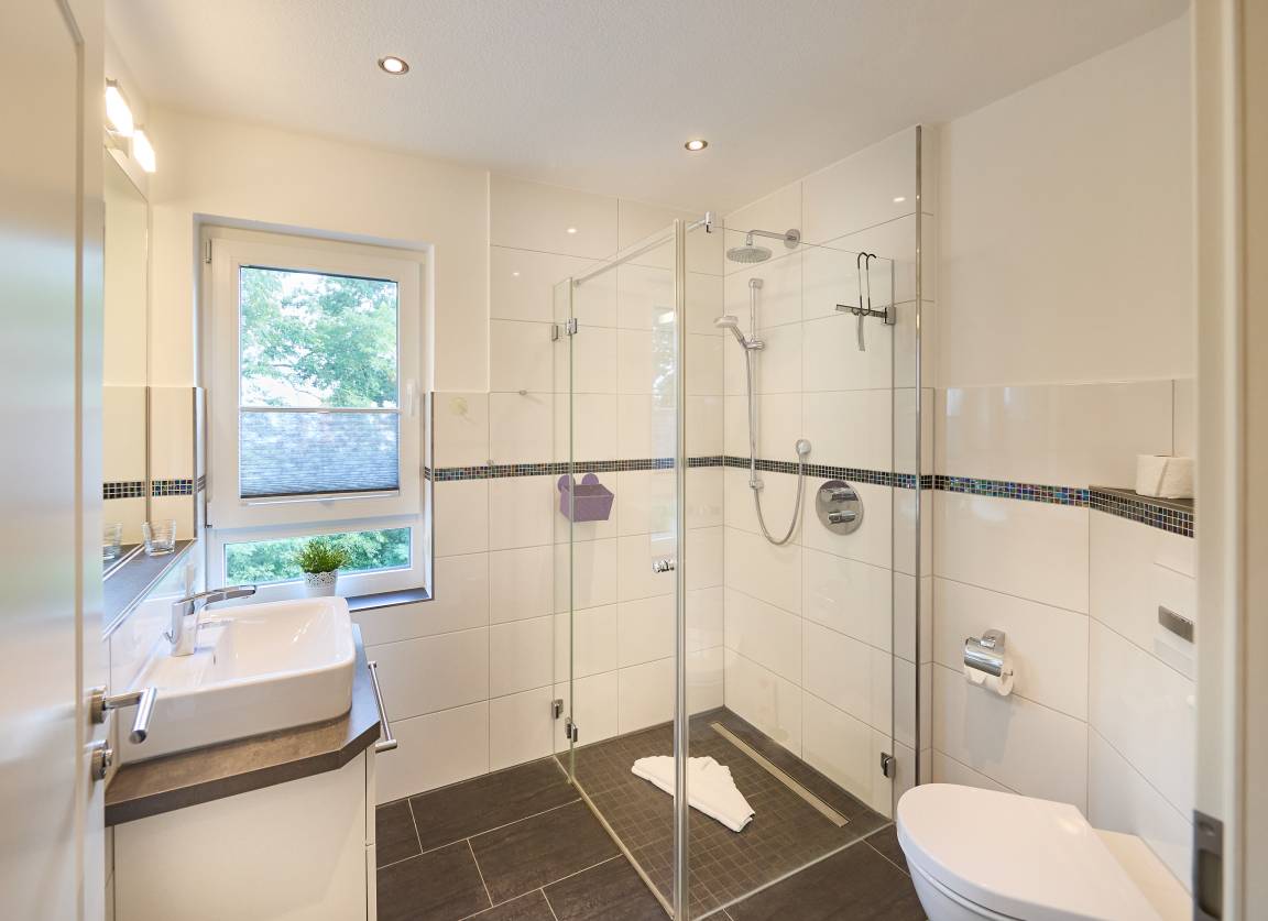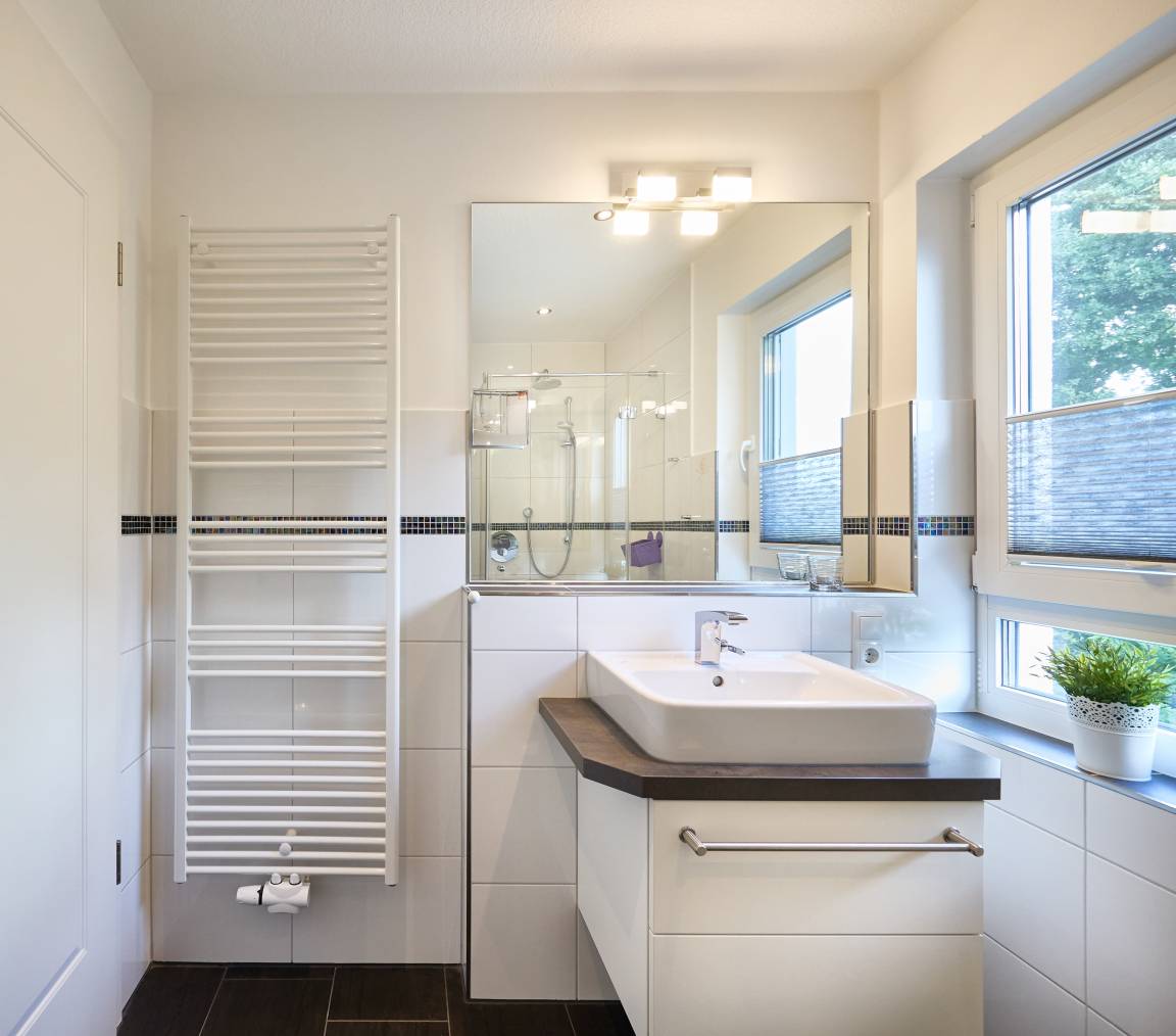 Die Einrichtung der Wohnung ist ansprechend und geschmackvoll gestaltet. Der Schlafbereich verfügt über komfortable Betten in seniorengerechter Komforthöhe sowie einen zusätzlichen Fernseher. Das angrenzende Duschbad mit WC bietet Ihnen Komfort und einen schönen Ausblick ins Grüne. Von hier aus können Sie sogar einen kleinen Blick auf das Meer erhaschen.