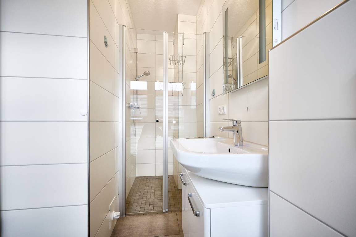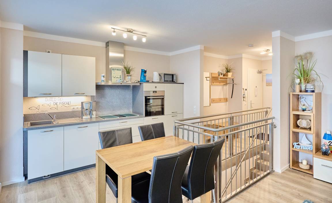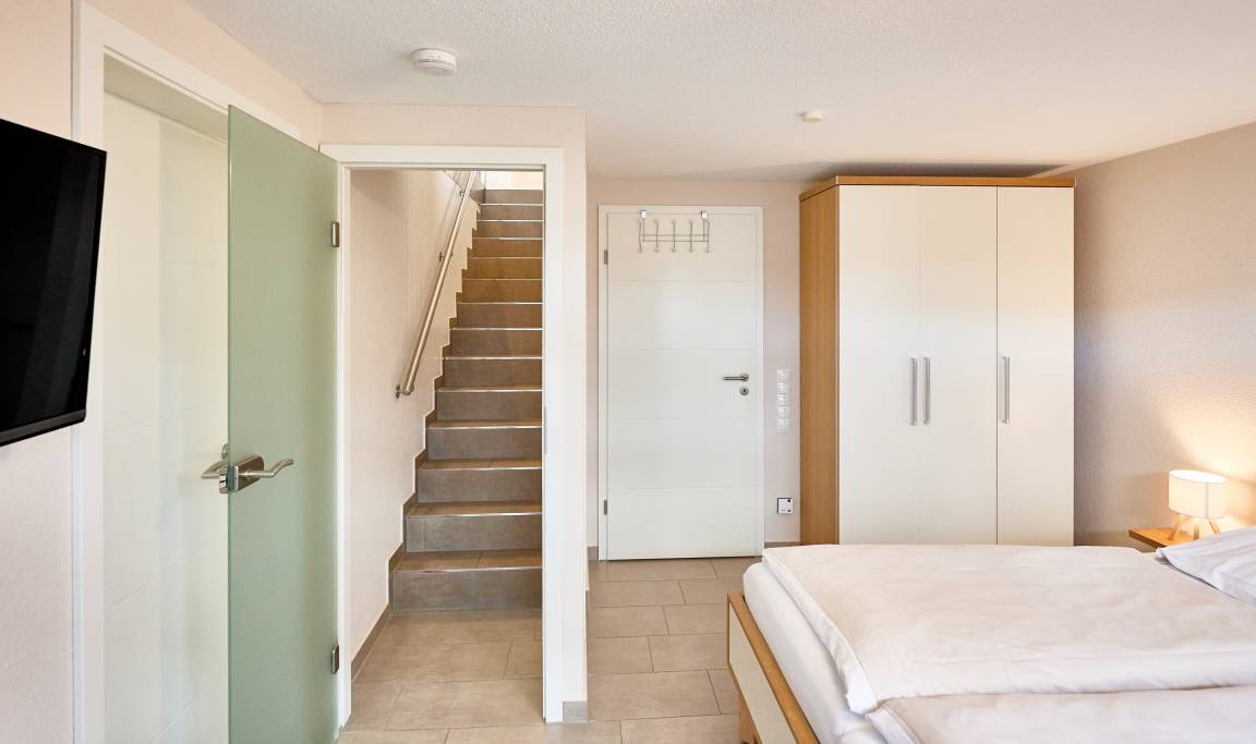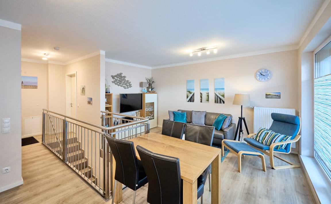 Es erwartet Sie hier eine geräumige und hochwertig ausgestattete Ferienwohnung über 2 Etagen für bis zu 4 Personen. Im 1. OG der Wohnung schlägt das Herz. Ein gemütlicher und zugleich moderner Wohn- und Essbereich erwartet Sie hier. Das Wohnzimmer besteht aus einer gemütlichen Couch, hier lässt es sich gut relaxen. Ein großer Balkon lädt zum morgendlichen Frühstücken oder abendlichen Entspannen ein. Auch befindet sich hier ein Doppelschlafzimmer mit einen begehbaren Duschbad mit WC. Vom Schlafzimmer haben Sie noch einen kleinen Balkon Richtung Süden. Vom Wohn- und Essbereich gelangen Sie ins Erdgeschoss der Wohnung. Hier befindet sich ein weiteres geräumiges Schlafzimmer mit Zugang zu einer großen und geschützten Terrasse, mit Zugang in das helle und großzügige Duschbad mit WC. Als besonderes Ausstattungsmerkmal befindet sich abgetrennt vom Schlafbereich noch ein Waschraum mit Waschmaschine und Trockner und Einbauschränken. Von hier aus haben Sie direkten Zugang zur eigenen Fahrradgarage in der Sie auch Koffer, Kinderwagen, Fahrradanhänger u.ä. abstellen können. In dieser befindet sich auch ein Stromanschluss für Ihre E-Bikes. Kommen Sie also von der Radtour in Ihr Urlaubsquartier und gehen direkt durch die Fahrradgarage (lässt sich mit Fernbedienung öffnen) in Ihre Wohnung. Toll. Ein PKW-Stellplatz befindet sich vor der Garage, wo Sie z.B. mitgebrachte Fahrräder sicher abstellen können, auf einer gekennzeichneten Fläche. Alle Räume haben Fenster und sind mit Außenrolläden versehen.
